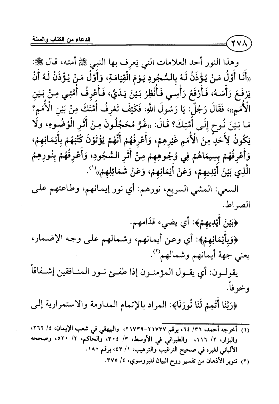 وهذا النور أحد العلامات التي يَعرِف بها النبي - صلى الله عليه وسلم - أمته، قال - صلى الله عليه وسلم -: ((أَنَا أَوَّلُ مَنْ يُؤْذَنُ لَهُ بِالسُّجُودِ يَوْمَ الْقِيَامَةِ، وَأَوَّلُ مَنْ يُؤْذَنُ لَهُ أَنْ يَرْفَعَ رَأْسَهُ، فَأَرْفَعُ رَأْسِي فَأُنْظِرُ بَيْنَ يَدَيَّ، فَأَعْرِفُ أُمَّتِي مِنْ بَيْنِ الْأُمَمِ))، فَقَالَ رَجُلٌ: يَا رَسُولَ اللَّهِ، فَكَيْفَ تَعْرِفُ أُمَّتَكَ مِنْ بَيْنِ الْأُمَمِ؟ مَا بَيْنَ نُوحٍ إِلَى أُمَّتِكَ؟ قَالَ: ((غُرٌّ مُحَجَّلُونَ مِنْ أَثَرِ الْوُضُوءِ، ولَا يَكُونُ لِأَحَدٍ مِنَ الْأُمَمِ غَيْرِهِمْ، وَأَعْرِفُهُمْ أَنَّهُمْ يُؤْتَوْنَ كُتُبَهُمْ بِأَيْمَانِهِمْ، وَأَعْرِفُهُمْ بِسِيمَاهُمْ فِي وُجُوهِهِمْ مِنْ أَثَرِ السُّجُودِ، وَأَعْرِفُهُمْ بِنُورِهِمُ الَّذِي بَيْنَ أَيْدِيهِمْ، وَعَنْ أَيْمَانِهِمْ، وَعَنْ شَمَائِلِهِمْ)) (¬1).