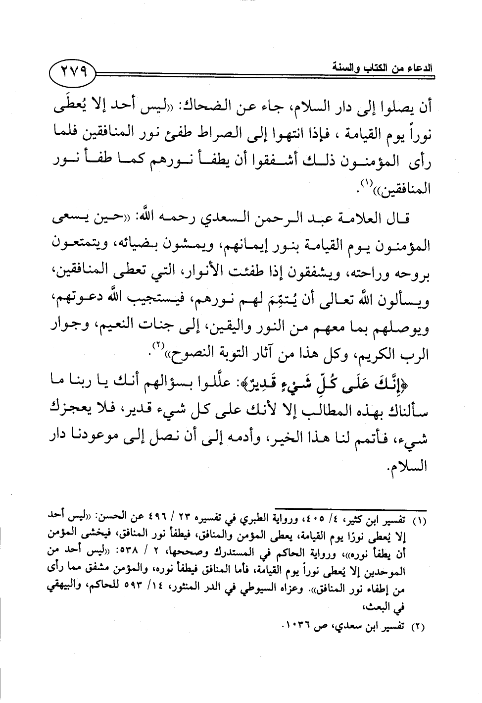 قال العلامة عبد الرحمن السعدي رحمه اللَّه: ((حين يسعى المؤمنون يوم القيامة بنور إيمانهم، ويمشون بضيائه، ويتمتعون بروحه وراحته، ويشفقون إذا طفئت الأنوار، التي تعطى المنافقين، ويسألون اللَّه تعالى أن يُتمِّمَ لهم نورهم، فيستجيب اللَّه دعوتهم، ويوصلهم بما معهم من النور واليقين، إلى جنات النعيم، وجوار الرب الكريم، وكل هذا من آثار التوبة النصوح)) (¬2).