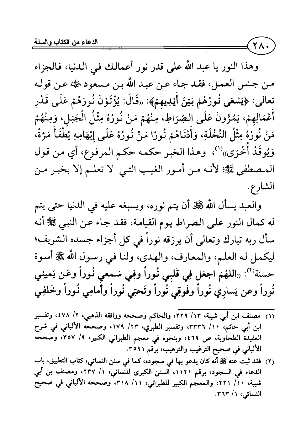والعبد يسأل اللَّه - عز وجل - أن يتم نوره، ويسبغه عليه في الدنيا حتى يتم له كمال النور على الصراط يوم القيامة، فقد جاء عن النبي - صلى الله عليه وسلم - أنه سأل ربه تبارك وتعالى أن يرزقه نوراً في كل أجزاء جسده الشريف؛ ليكمل له العلم، والمعارف، والهدى، ولنا في رسول اللَّه - صلى الله عليه وسلم - أسوة حسنة (¬2): ((اللهُمَ اجعَل فِي قَلبِي نُوراً وفِي سَمعي نُوراً وعَن يَمينِي