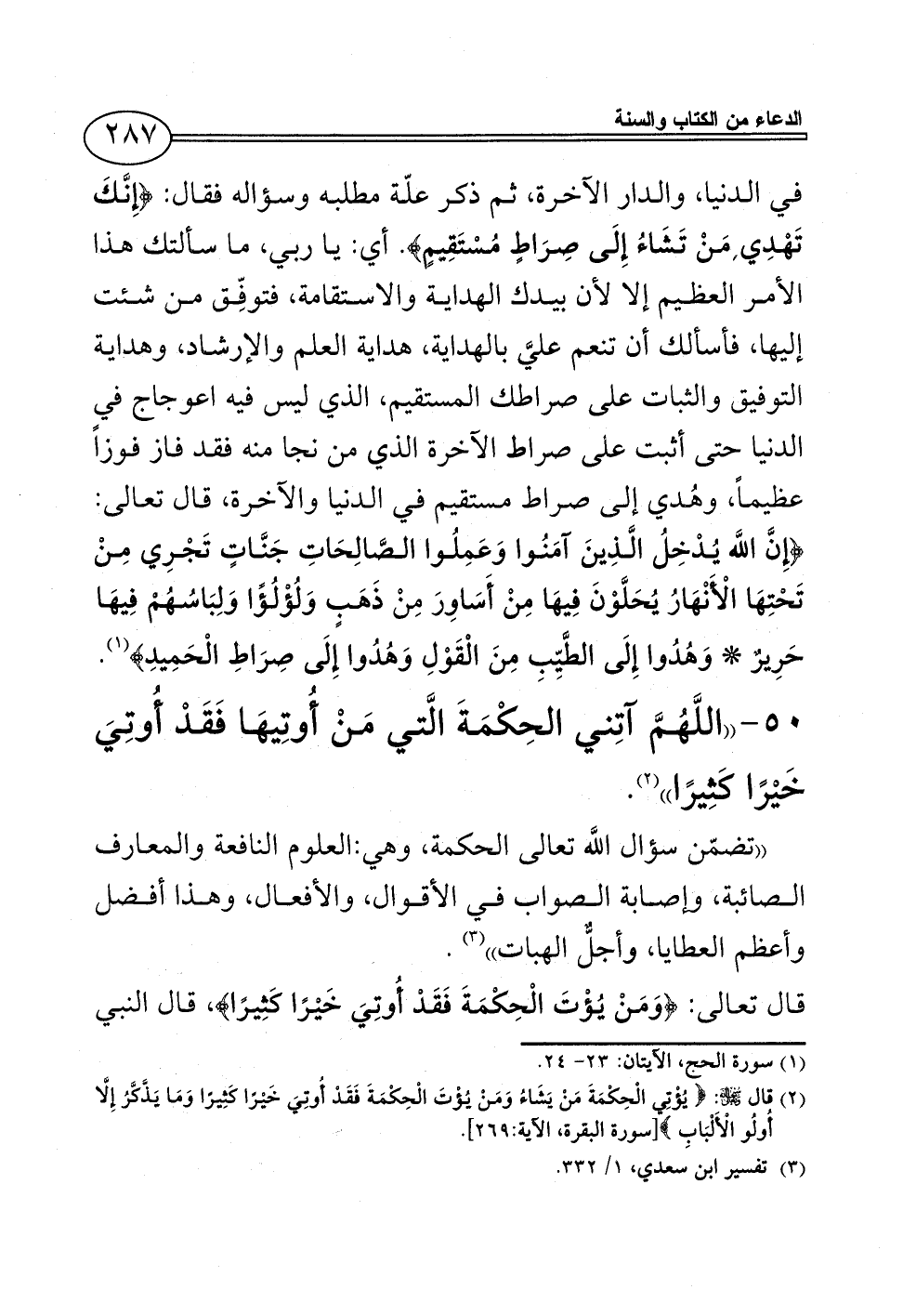 50 - ((اللَّهُمَّ آتِني الحِكْمَةَ الَّتي مَنْ أُوتِيهَا فَقَدْ أُوتِيَ خَيْرًا كَثِيرًا)) (¬2).