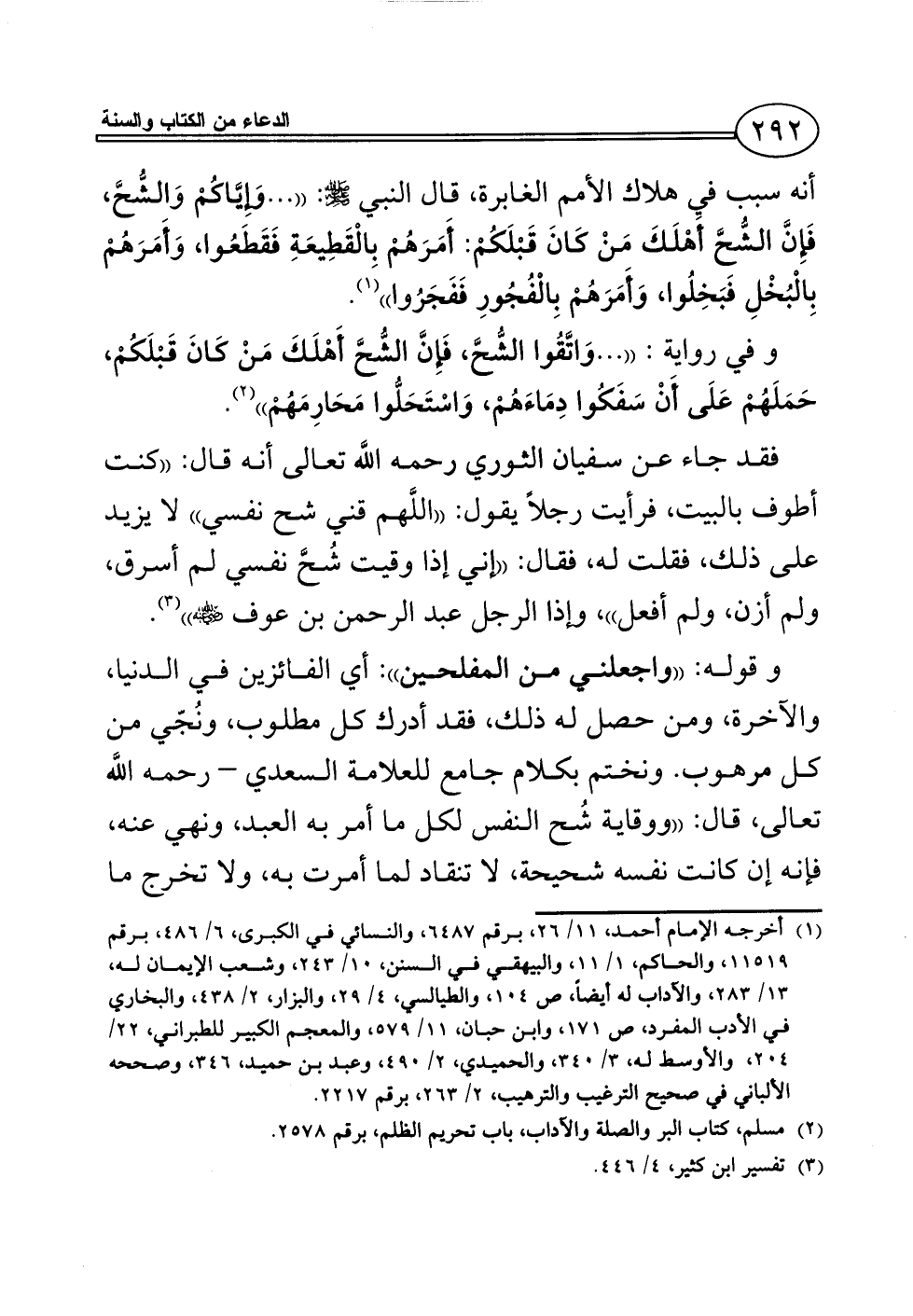 وفي رواية: (( ... وَاتَّقُوا الشُّحَّ، فَإِنَّ الشُّحَّ أَهْلَكَ مَنْ كَانَ قَبْلَكُمْ، حَمَلَهُمْ عَلَى أَنْ سَفَكُوا دِمَاءَهُمْ، وَاسْتَحَلُّوا مَحَارِمَهُمْ)) (¬2).