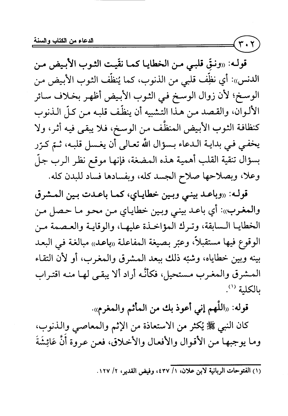 قوله: ((ونقِّ قلبي من الخطايا كما نقّيت الثوب الأبيض من الدنس)): أي نظِّف قلبي من الذنوب، كما يُنظّف الثوب الأبيض من الوسخ؛ لأن زوال الوسخ في الثوب الأبيض أظهر بخلاف سائر الألوان، والقصد من هذا التشبيه أن ينظّف قلبه من كلّ الذنوب كنظافة الثوب الأبيض المنظَّف من الوسخ، فلا يبقى فيه أثر، ولا يخفي في بداية الدعاء بسؤال اللَّه تعالى أن يغسل قلبه، ثمّ كرّر بسؤال تنقية القلب أهمية هذه المضغة، فإنها موقع نظر الرب جلّ وعلا، وبصلاحها صلاح الجسد كله، وبفسادها فساد للبدن كله.
