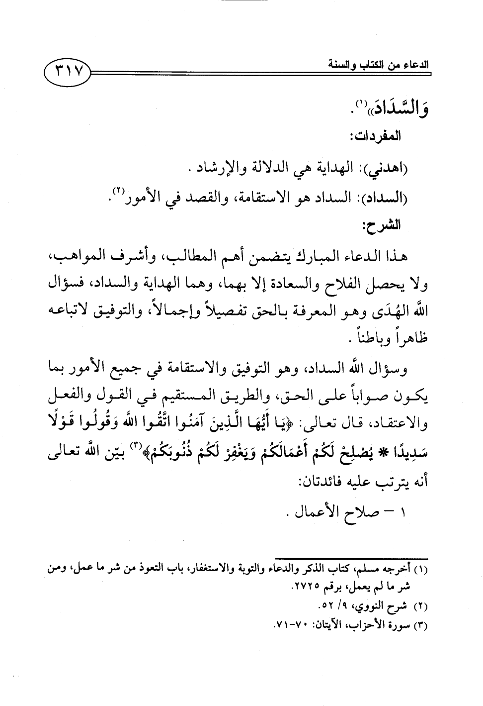 وسؤال اللَّه السداد، وهو التوفيق والاستقامة في جميع الأمور بما يكون صواباً على الحق، والطريق المستقيم في القول والفعل والاعتقاد، قال تعالى: {يَا أَيُّهَا الَّذِينَ آمَنُوا اتَّقُوا اللَّه وَقُولُوا قَوْلًا سَدِيدًا * يُصْلِحْ لَكُمْ أَعْمَالَكُمْ وَيَغْفِرْ لَكُمْ ذُنُوبَكُمْ} (¬3) بيّن اللَّه تعالى أنه يترتب عليه فائدتان: