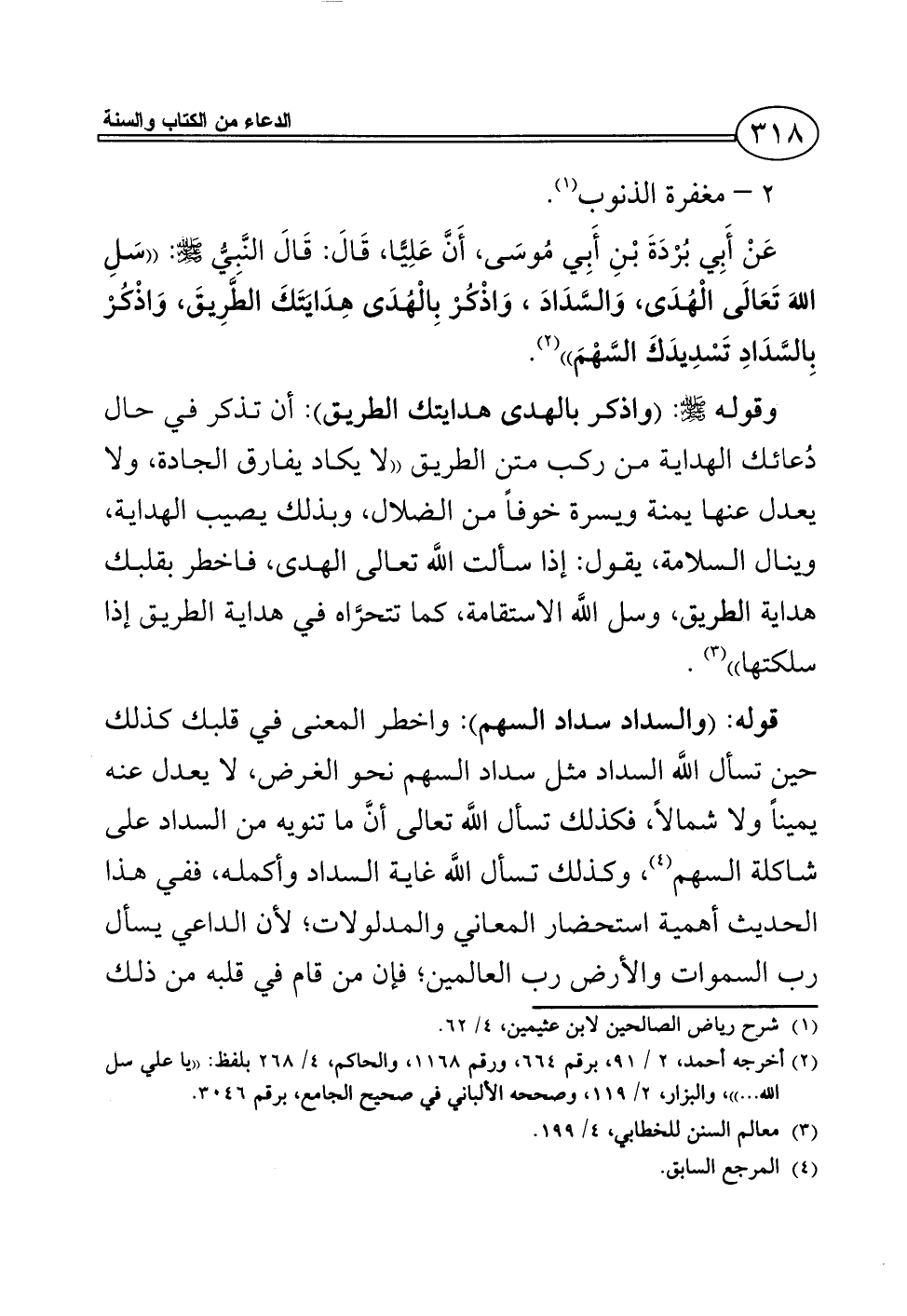 عَنْ أَبِي بُرْدَةَ بْنِ أَبِي مُوسَى، أَنَّ عَلِيًّا، قَالَ: قَالَ النَّبِيُّ - صلى الله عليه وسلم -: ((سَلِ اللهَ تَعَالَى الْهُدَى، وَالسَّدَادَ، وَاذْكُرْ بِالْهُدَى هِدَايَتَكَ الطَّرِيقَ، وَاذْكُرْ بِالسَّدَادِ تَسْدِيدَكَ السَّهْمَ)) (¬2).