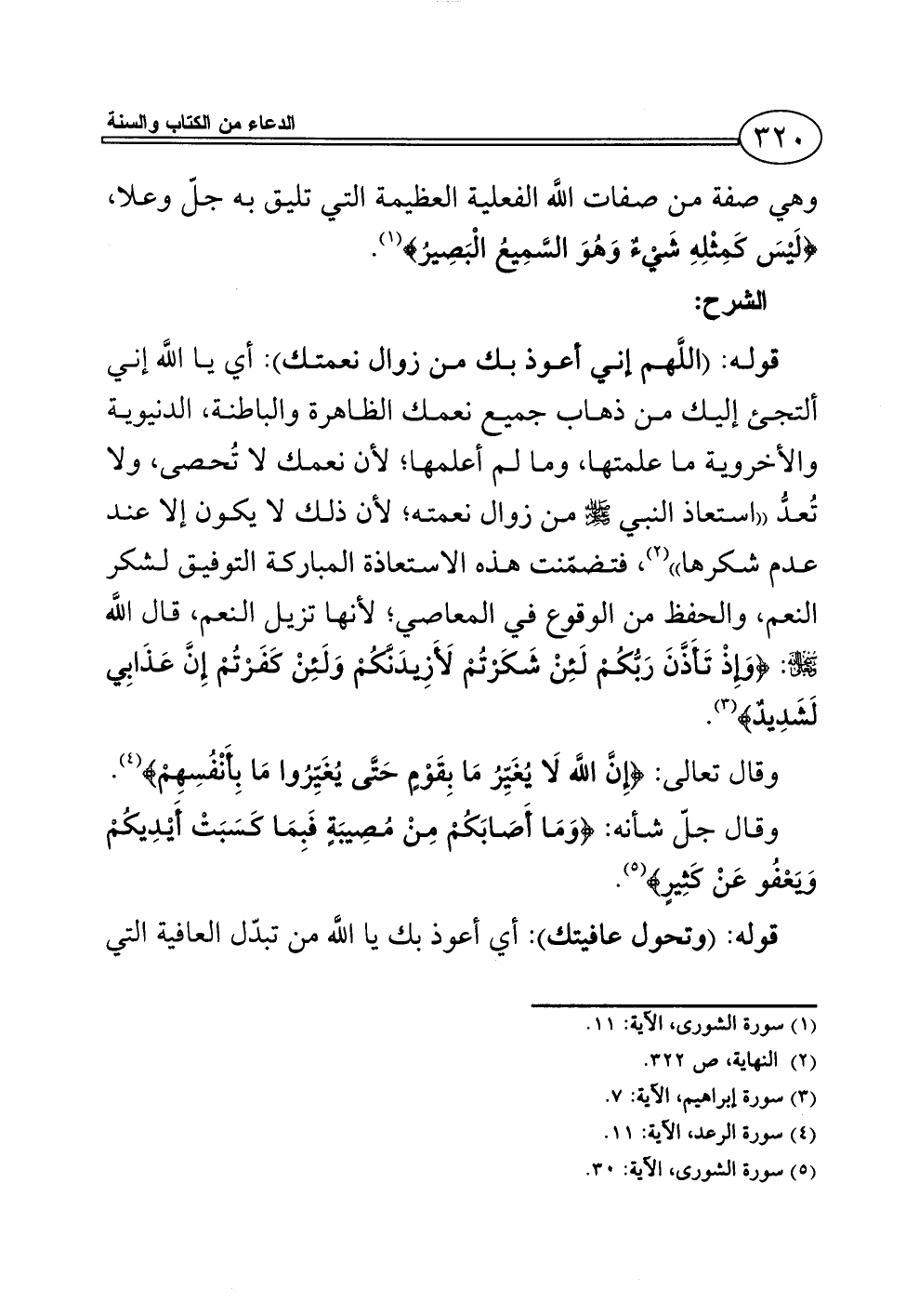 قوله: (اللَّهم إني أعوذ بك من زوال نعمتك): أي يا اللَّه إني ألتجئ إليك من ذهاب جميع نعمك الظاهرة والباطنة، الدنيوية والأخروية ما علمتها، وما لم أعلمها؛ لأن نعمك لا تُحصى، ولا تُعدُّ ((استعاذ النبي - صلى الله عليه وسلم - من زوال نعمته؛ لأن ذلك لا يكون إلا عند عدم شكرها)) (¬2)، فتضمّنت هذه الاستعاذة المباركة التوفيق لشكر النعم، والحفظ من الوقوع في المعاصي؛ لأنها تزيل النعم، قال اللَّه - سبحانه وتعالى -: {وَإِذْ تَأَذَّنَ رَبُّكُمْ لَئِنْ شَكَرْتُمْ لَأَزِيدَنَّكُمْ وَلَئِنْ كَفَرْتُمْ إِنَّ عَذَابِي