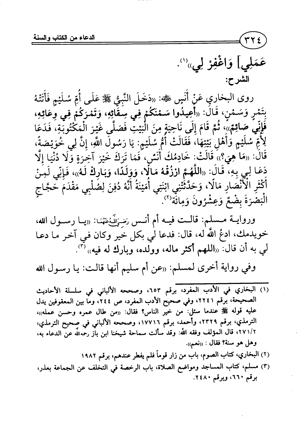 روى البخاري عَنْ أَنَسٍ - رضي الله عنه -: ((دَخَلَ النَّبِيُّ - صلى الله عليه وسلم - عَلَى أُمِّ سُلَيْمٍ فَأَتَتْهُ بِتَمْرٍ وَسَمْنٍ، قَالَ: ((أَعِيدُوا سَمْنَكُمْ فِي سِقَائِهِ، وَتَمْرَكُمْ فِي وِعَائِهِ، فَإِنِّي صَائِمٌ))، ثُمَّ قَامَ إِلَى نَاحِيَةٍ مِنَ الْبَيْتِ فَصَلَّى غَيْرَ الْمَكْتُوبَةِ، فَدَعَا لِأُمِّ سُلَيْمٍ وَأَهْلِ بَيْتِهَا، فَقَالَتْ أُمُّ سُلَيْمٍ: يَا رَسُولَ اللَّهِ، إِنَّ لِي خُوَيْصَةً، قَالَ: ((مَا هِيَ؟)) قَالَتْ: خَادِمُكَ أَنَسٌ، فَمَا تَرَكَ خَيْرَ آخِرَةٍ وَلَا دُنْيَا إِلَّا دَعَا لِي بِهِ، قَالَ: ((اللَّهُمَّ ارْزُقْهُ مَالًا، وَوَلَدًا، وَبَارِكْ لَهُ))، فَإِنِّي لَمِنْ