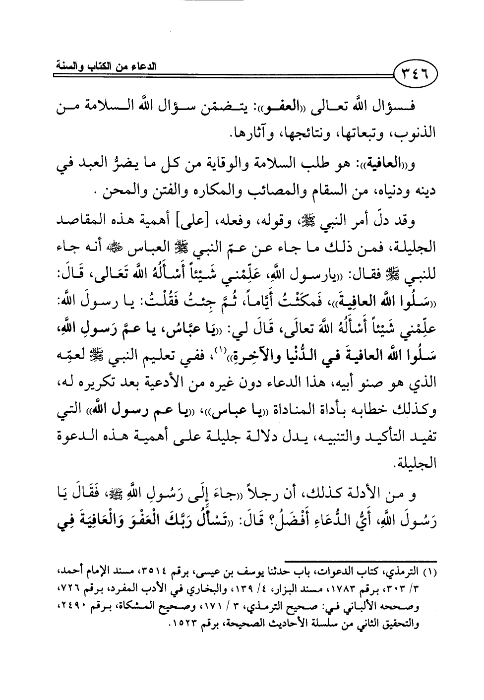 وقد دلّ أمر النبي - صلى الله عليه وسلم -، وقوله، وفعله، [على] أهمية هذه المقاصد الجليلة، فمن ذلك ما جاء عن عمّ النبي - صلى الله عليه وسلم - العباس - رضي الله عنه - أنه جاء للنبي - صلى الله عليه وسلم - فقال: ((يارسول اللَّهِ، عَلِّمْني شَيْئاً أَسْأَلُهُ اللَّه تَعَالى، قَالَ: ((سَلُوا اللَّه العافِيةَ))، فَمكَثْتُ أَيَّاماً، ثُمَّ جِئتُ فَقُلْتُ: يا رسولَ اللَّه: علِّمْني شَيْئاً أَسْأَلُهُ اللَّهَ تعالَى، قَالَ لي: ((يَا عبَّاسُ، يا عمَّ رَسولِ اللَّهِ، سَلُوا اللَّه العافيةَ في الدُّنْيا والآخِرةِ)) (¬1)، ففي تعليم النبي - صلى الله عليه وسلم - لعمِّه