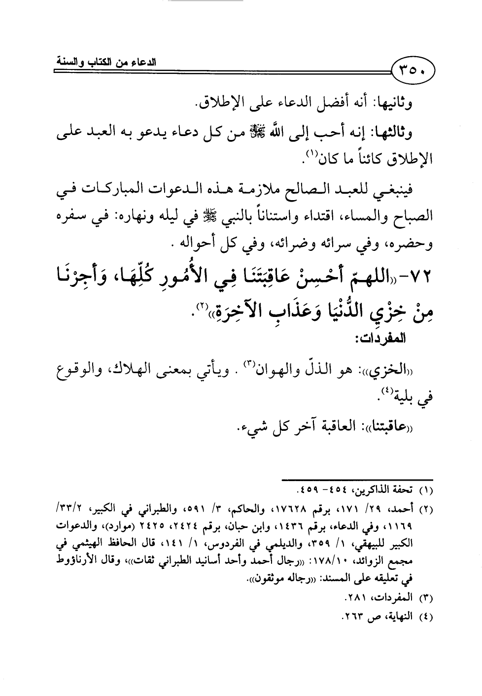 (¬2) أحمد، 29/ 171، برقم 17628، والحاكم، 3/ 591، والطبراني في الكبير، 2/ 33/ 1169، وفي الدعاء، برقم 1436، وابن حبان، برقم 2424، 2425 (موارد)، والدعوات الكبير للبيهقي، 1/ 359، والديلمي في الفردوس، 1/ 141، قال الحافظ الهيثمي في مجمع الزوائد، 10/ 178: ((رجال أحمد وأحد أسانيد الطبراني ثقات))، وقال الأرناؤوط في تعليقه على المسند: ((رجاله موثقون)).