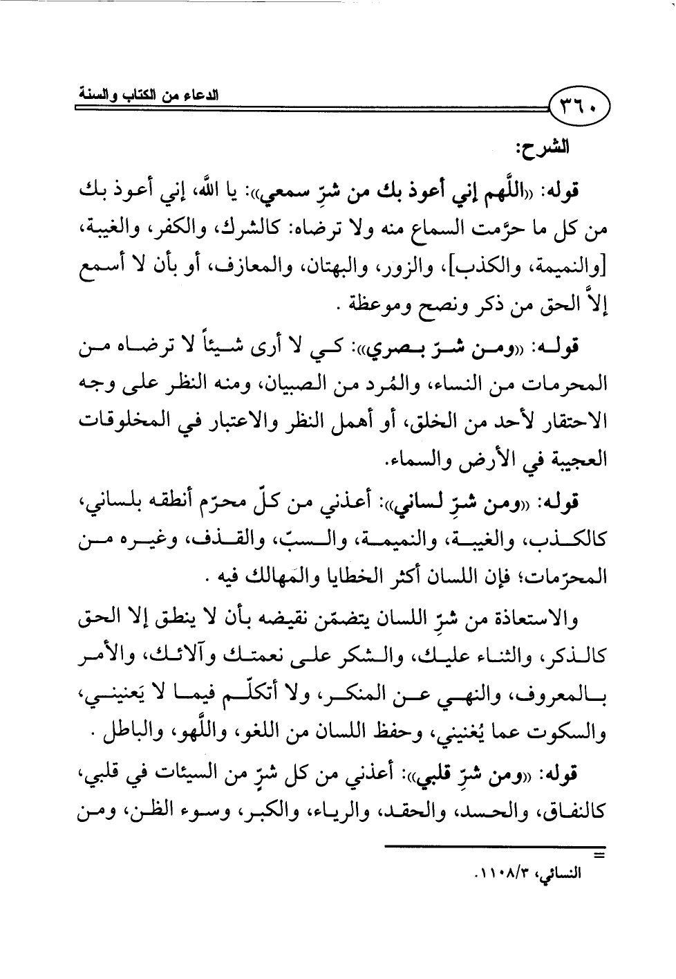 قوله: ((اللَّهم إني أعوذ بك من شرِّ سمعي)): يا اللَّه، إني أعوذ بك من كل ما حرَّمت السماع منه ولا ترضاه: كالشرك، والكفر، والغيبة، [والنميمة، والكذب]، والزور، والبهتان، والمعازف، أو بأن لا أسمع إلاَّ الحق من ذكر ونصح وموعظة.