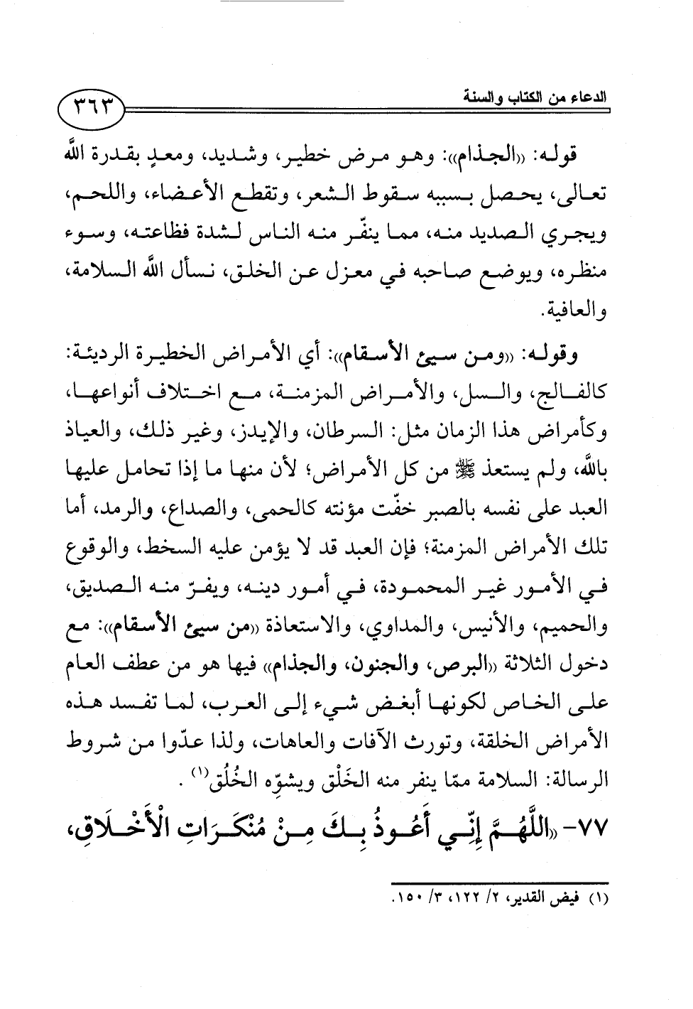 والحميم، والأنيس، والمداوي، والاستعاذة ((من سيئ الأسقام)): مع دخول الثلاثة ((البرص، والجنون، والجذام)) فيها هو من عطف العام على الخاص لكونها أبغض شيء إلى العرب، لما تفسد هذه الأمراض الخلقة، وتورث الآفات والعاهات، ولذا عدّوا من شروط الرسالة: السلامة ممّا ينفر منه الخَلْق ويشوِّه الخُلُق (¬1).