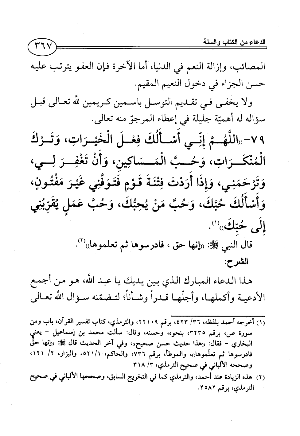 79 - ((اللَّهُمَّ إِنِّي أَسْأَلُكَ فِعْلَ الْخَيْرَاتِ، وَتَرْكَ الْمُنْكَرَاتِ، وَحُبَّ الْمَسَاكِينِ، وَأَنْ تَغْفِرَ لِي، وَتَرْحَمَنِي، وَإِذَا أَرَدْتَ فِتْنَةَ قَوْمٍ فَتَوَفَّنِي غَيْرَ مَفْتُونٍ، وَأَسْأَلُكَ حُبَّكَ، وَحُبَّ مَنْ يُحِبُّكَ، وَحُبَّ عَمَلٍ يُقَرِّبُنِي إِلَى حُبِّكَ)) (¬1).