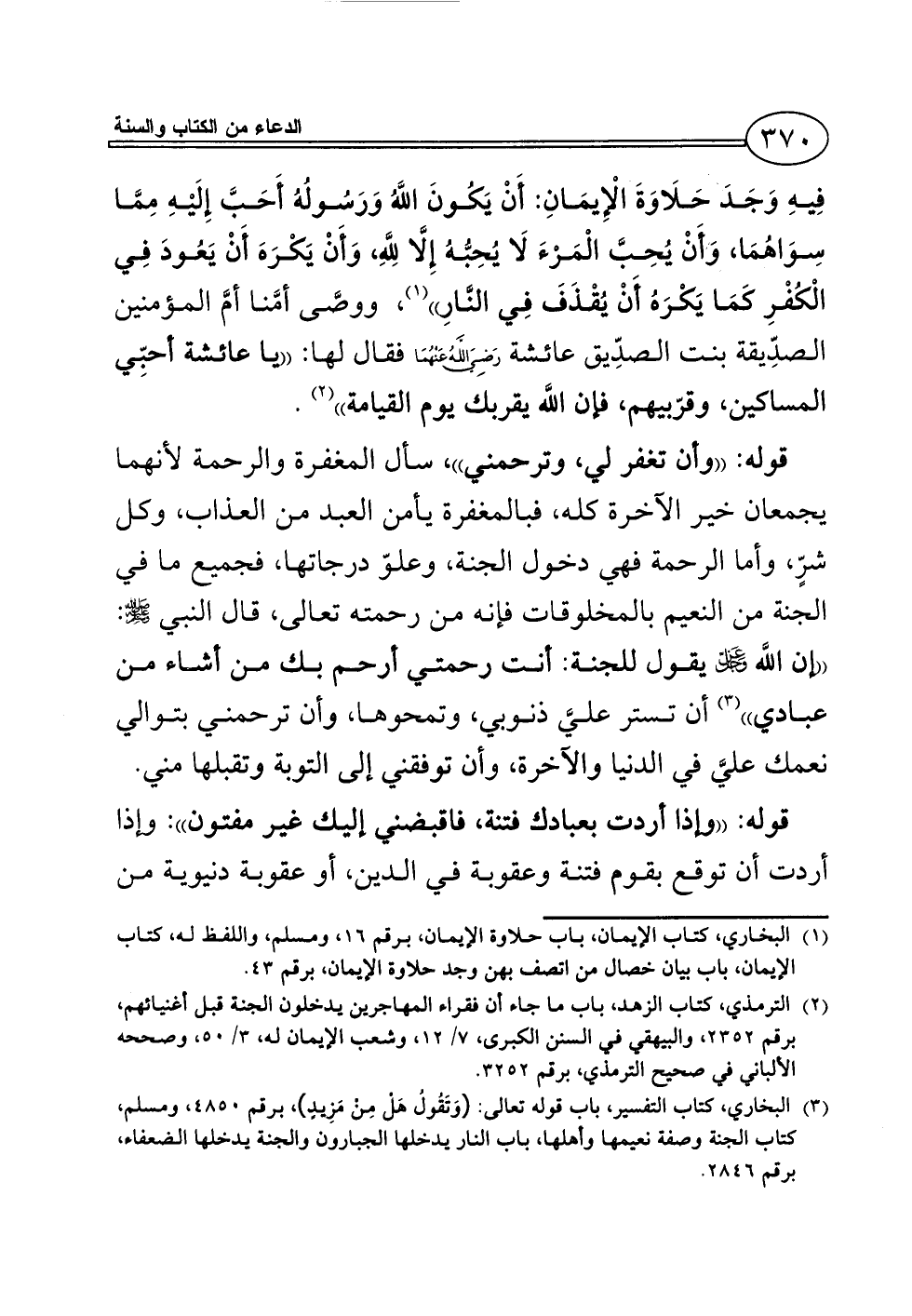 الجنة من النعيم بالمخلوقات فإنه من رحمته تعالى، قال النبي - صلى الله عليه وسلم -: ((إن اللَّه - عز وجل - يقول للجنة: أنت رحمتي أرحم بك من أشاء من عبادي)) (¬3) أن تستر عليَّ ذنوبي، وتمحوها، وأن ترحمني بتوالي نعمك عليَّ في الدنيا والآخرة، وأن توفقني إلى التوبة وتقبلها مني.