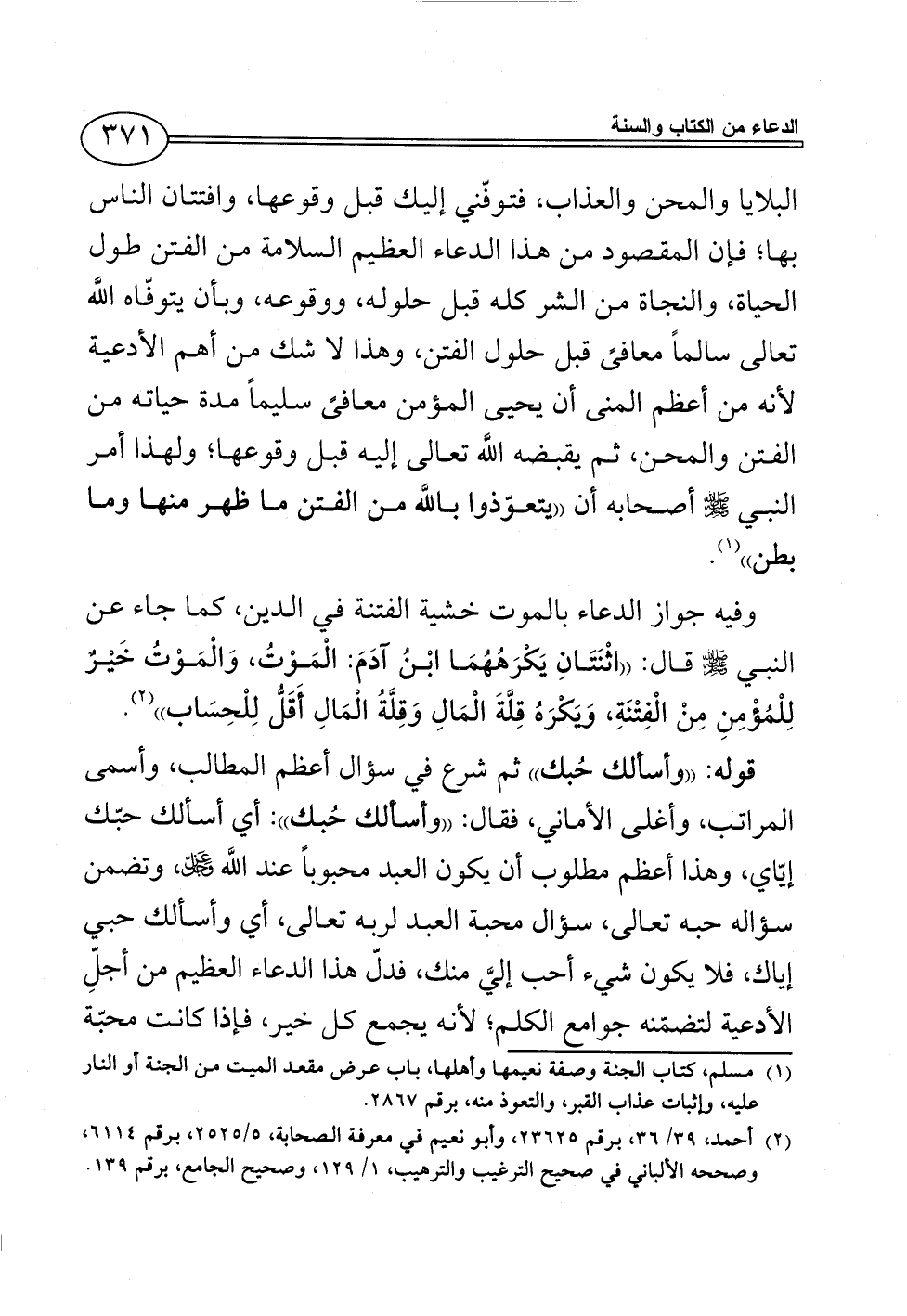 البلايا والمحن والعذاب، فتوفّني إليك قبل وقوعها، وافتتان الناس بها؛ فإن المقصود من هذا الدعاء العظيم السلامة من الفتن طول الحياة، والنجاة من الشر كله قبل حلوله، ووقوعه، وبأن يتوفّاه اللَّه تعالى سالماً معافىً قبل حلول الفتن، وهذا لا شك من أهم الأدعية لأنه من أعظم المنى أن يحيى المؤمن معافىً سليماً مدة حياته من الفتن والمحن، ثم يقبضه اللَّه تعالى إليه قبل وقوعها؛ ولهذا أمر النبي - صلى الله عليه وسلم - أصحابه أن ((يتعوّذوا باللَّه من الفتن ما ظهر منها وما بطن)) (¬1).