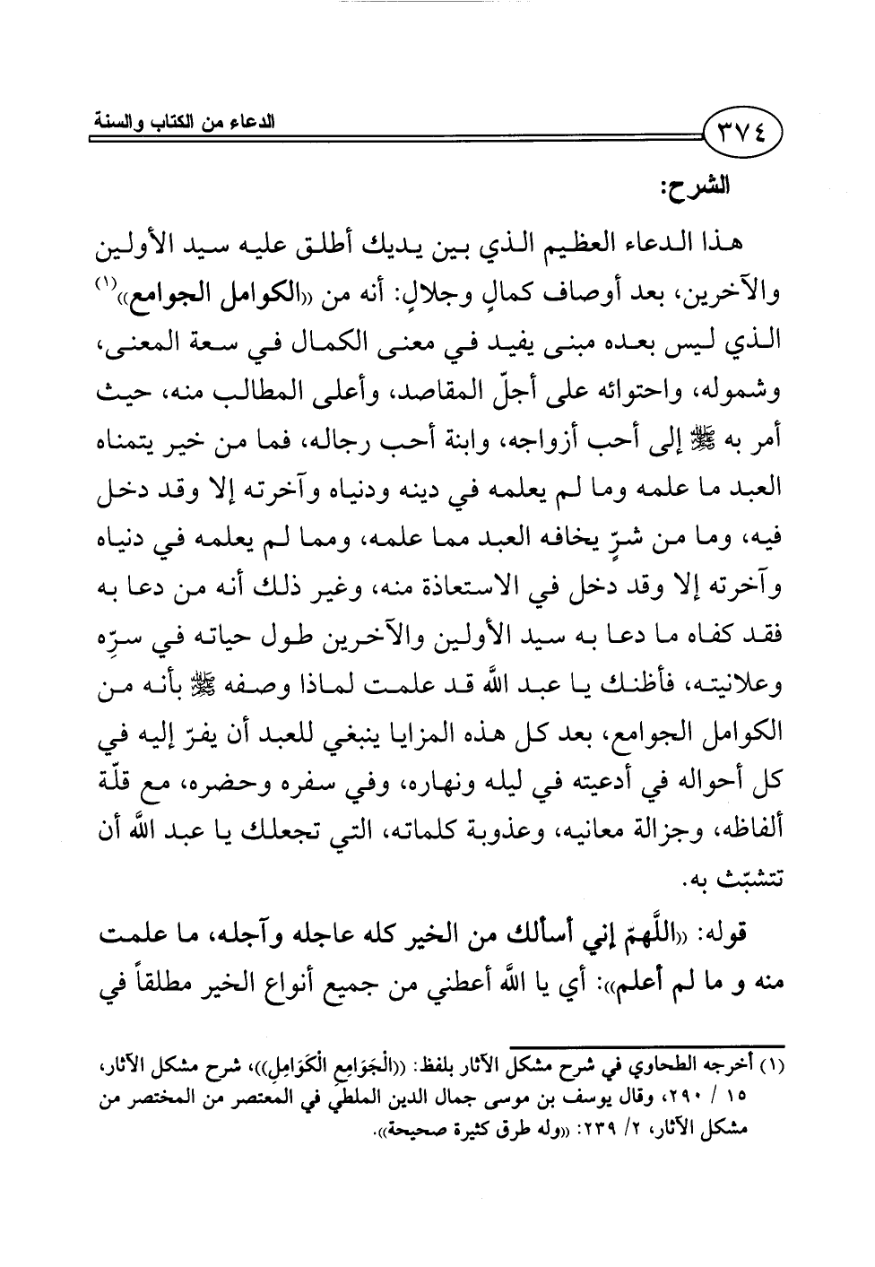 هذا الدعاء العظيم الذي بين يديك أطلق عليه سيد الأولين والآخرين، بعد أوصاف كمالٍ وجلالٍ: أنه من ((الكوامل الجوامع)) (¬1) الذي ليس بعده مبنى يفيد في معنى الكمال في سعة المعنى، وشموله، واحتوائه على أجلّ المقاصد، وأعلى المطالب منه، حيث أمر به - صلى الله عليه وسلم - إلى أحب أزواجه، وابنة أحب رجاله، فما من خير يتمناه العبد ما علمه وما لم يعلمه في دينه ودنياه وآخرته إلا وقد دخل فيه، وما من شرٍّ يخافه العبد مما علمه، ومما لم يعلمه في دنياه وآخرته إلا وقد دخل في الاستعاذة منه, وغير ذلك أنه من دعا به فقد كفاه ما دعا به سيد الأولين والآخرين طول حياته في سرِّه وعلانيته، فأظنك يا عبد اللَّه قد علمت لماذا وصفه - صلى الله عليه وسلم - بأنه من