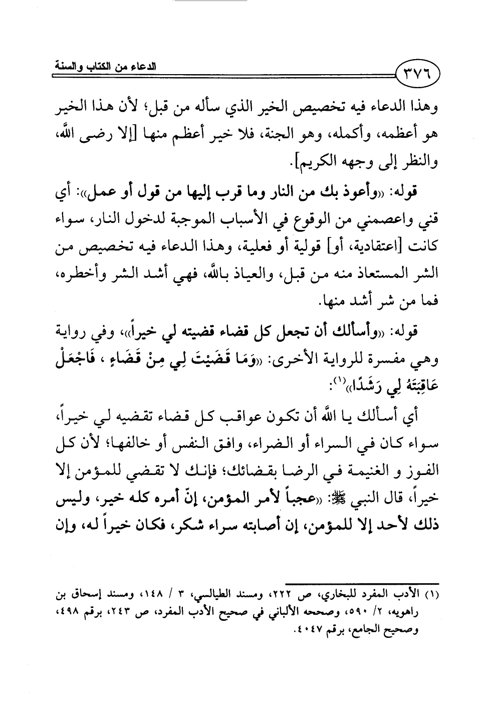 أي أسألك يا اللَّه أن تكون عواقب كل قضاء تقضيه لي خيراً، سواء كان في السراء أو الضراء، وافق النفس أو خالفها؛ لأن كل الفوز والغنيمة في الرضا بقضائك؛ فإنك لا تقضي للمؤمن إلا خيراً، قال النبي - صلى الله عليه وسلم -: ((عجباً لأمر المؤمن، إنّ أمره كله خير، وليس ذلك لأحد إلا للمؤمن، إن أصابته سراء شكر، فكان خيراً له، وإن