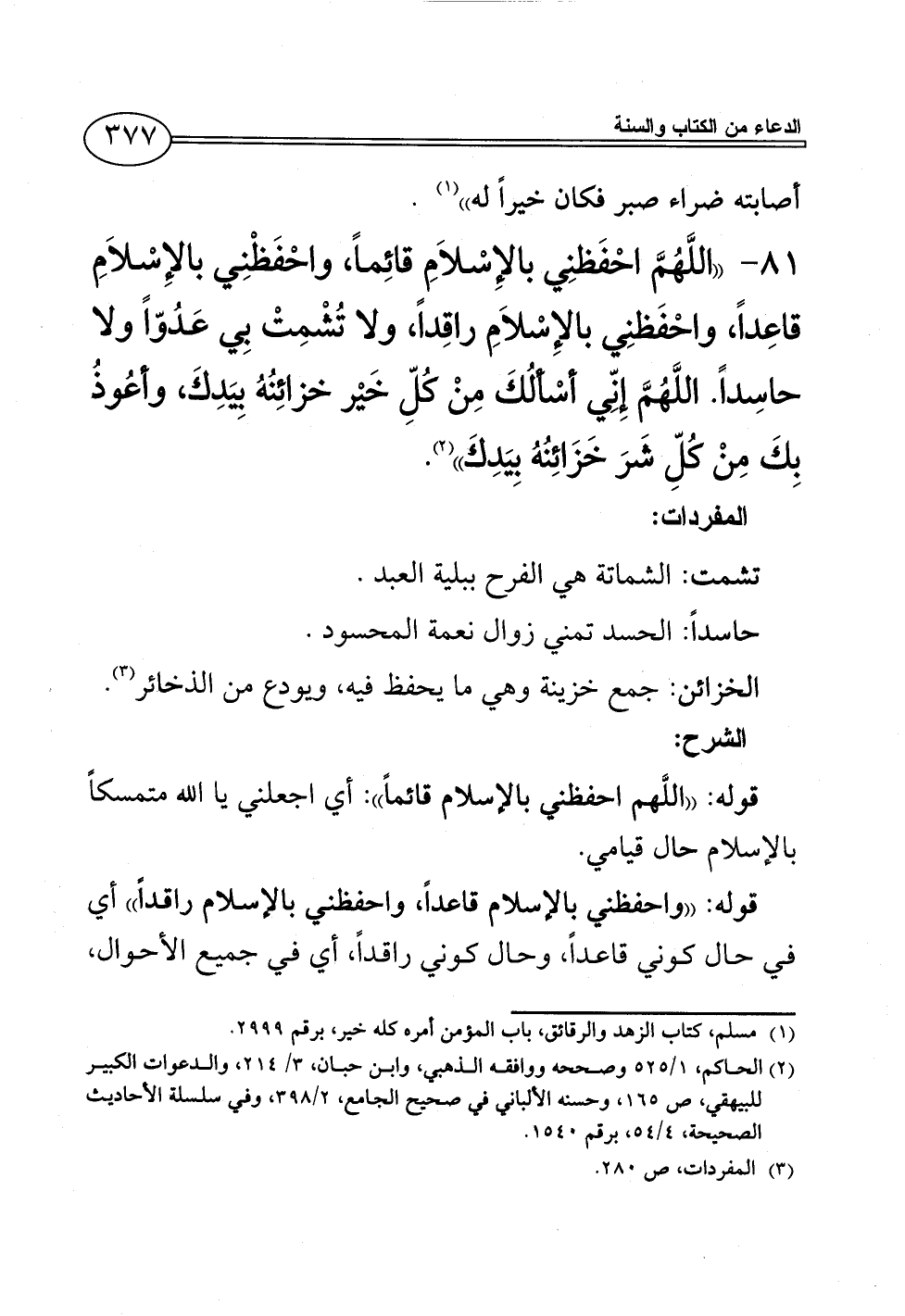 81 - ((اللَّهُمَّ احْفَظنِي بالإِسْلاَمِ قائِماً، واحْفَظْنِي بالإِسْلاَمِ قاعِداً، واحْفَظنِي بالإِسْلاَمِ راقِداً، ولا تُشْمِتْ بِي عَدُوّاً ولا حاسِداً. اللَّهُمَّ إِنِّي أسْألُكَ مِنْ كُلِّ خَيْر خزائِنُهُ بِيَدِكَ، وأعُوذُ بِكَ مِنْ كُلِّ شَرَ خَزَائِنُهُ بِيَدِكَ)) (¬2).