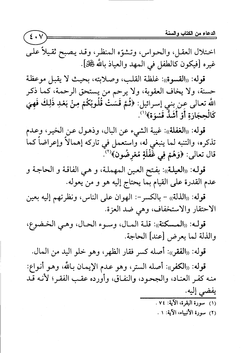قوله: ((القسوة)): غلظة القلب, وصلابته، بحيث لا يقبل موعظة حسنة، ولا يخاف العقوبة، ولا يرحم من يستحق الرحمة، كما ذكر اللَّه تعالى عن بني إسرائيل: {ثُمَّ قَسَتْ قُلُوبُكُمْ مِنْ بَعْدِ ذَلِكَ فَهِيَ كَالْحِجَارَةِ أَوْ أَشَدُّ قَسْوَة} (¬1).
