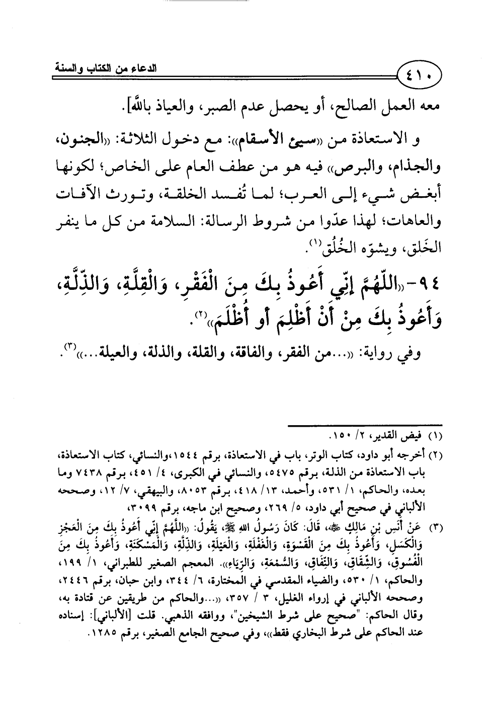 (¬2) أخرجه أبو داود، كتاب الوتر، باب في الاستعاذة، برقم 1544،والنسائي، كتاب الاستعاذة، باب الاستعاذة من الذلة، برقم 5475، والنسائي في الكبرى، 4/ 451، برقم 7438 وما بعده، والحاكم، 1/ 531، وأحمد، 13/ 418، برقم 8053، والبيهقي، 7/ 12، وصححه الألباني في صحيح أبي داود، 5/ 269، وصحيح ابن ماجه، برقم 3099،