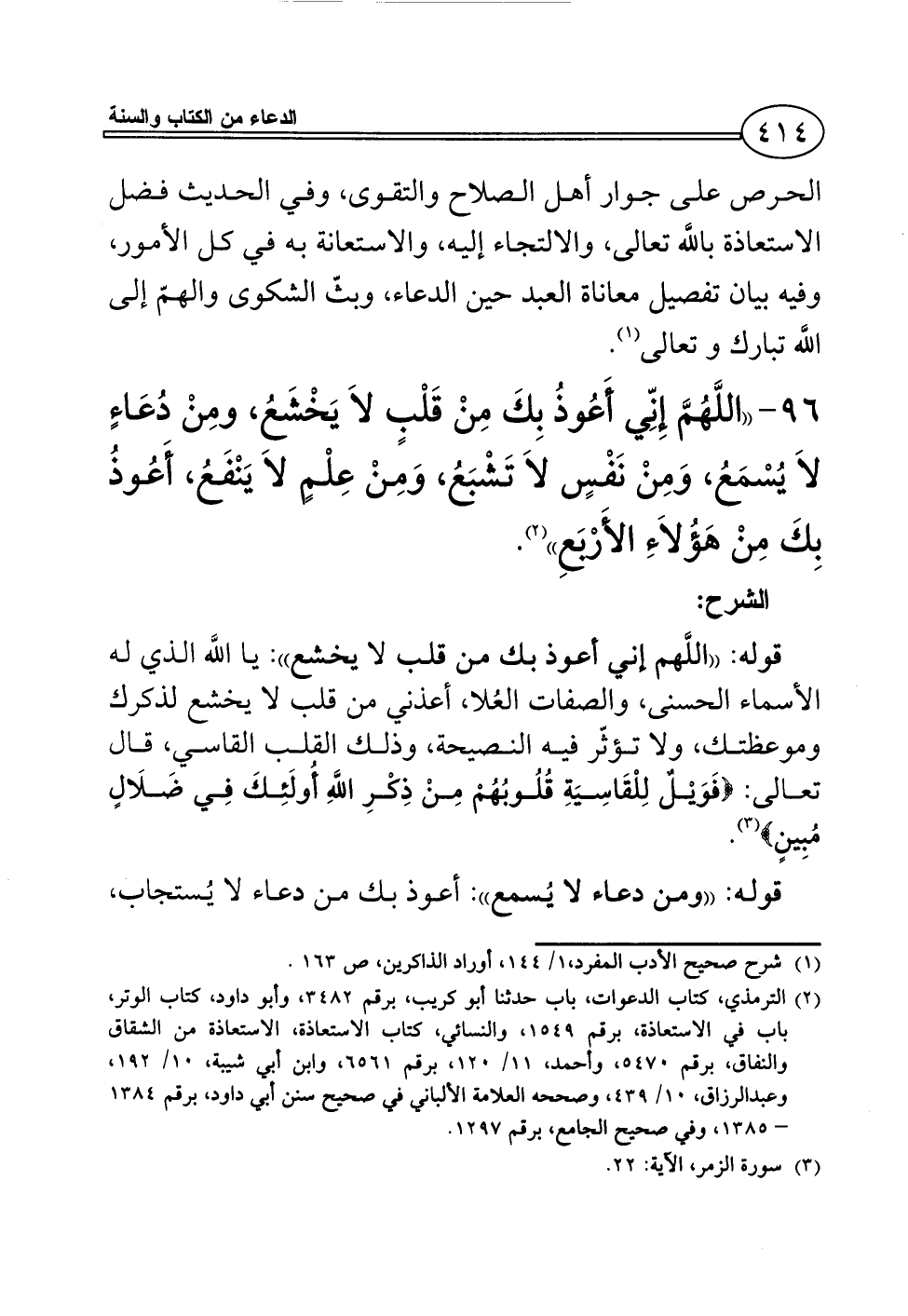 96 - ((اللَّهُمَّ إِنِّي أَعُوذُ بِكَ مِنْ قَلْبٍ لاَ يَخْشَعُ، ومِنْ دُعَاءٍ لاَ يُسْمَعُ، وَمِنْ نَفْسٍ لاَ تَشْبَعُ، وَمِنْ عِلْمٍ لاَ يَنْفَعُ، أَعُوذُ بِكَ مِنْ هَؤُلاَءِ الأَرْبَعِ)) (¬2).
