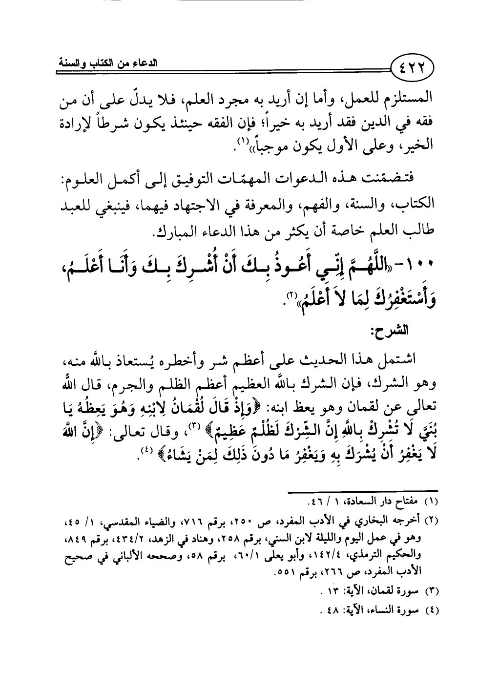100 - ((اللَّهُمَّ إِنِّي أَعُوذُ بِكَ أَنْ أُشْرِكَ بِكَ وَأَنَا أَعْلَمُ، وَأَسْتَغْفِرُكَ لِمَا لاَ أَعْلَمُ)) (¬2).