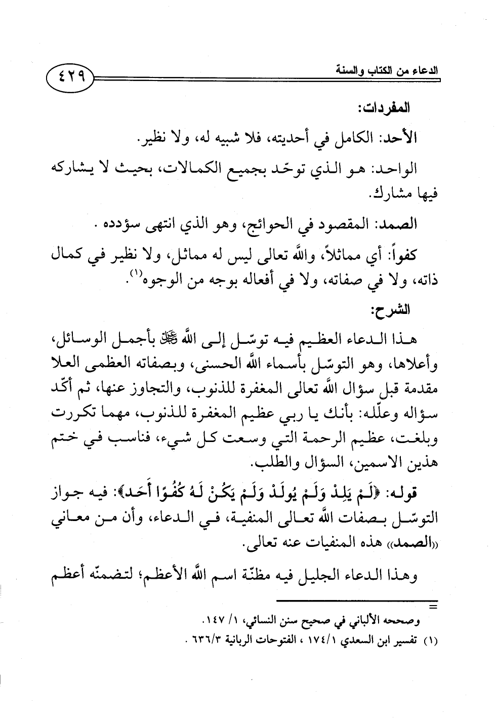قوله: {لَمْ يَلِدْ وَلَمْ يُولَدْ وَلَمْ يَكُنْ لَهُ كُفُوًا أَحَد}: فيه جواز التوسّل بصفات اللَّه تعالى المنفية, في الدعاء, وأن من معاني ((الصمد)) هذه المنفيات عنه تعالى.