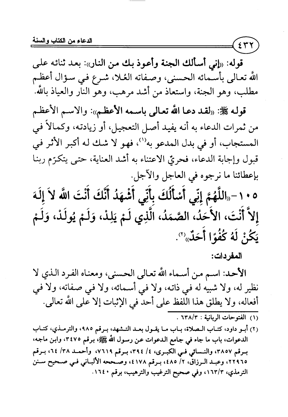 105 - ((اللَّهُمَّ إِنِّي أَسْأَلُكَ بِأَنِّي أَشْهَدُ أَنَّكَ أَنْتَ اللَّه لاَ إِلَهَ إِلاَّ أَنْتَ، الأَحَدُ، الصَّمَدُ، الَّذِي لَمْ يَلِدْ، وَلَمْ يُولَدْ، وَلَمْ يَكُنْ لَهُ كُفُوًا أَحَدٌ)) (¬2).