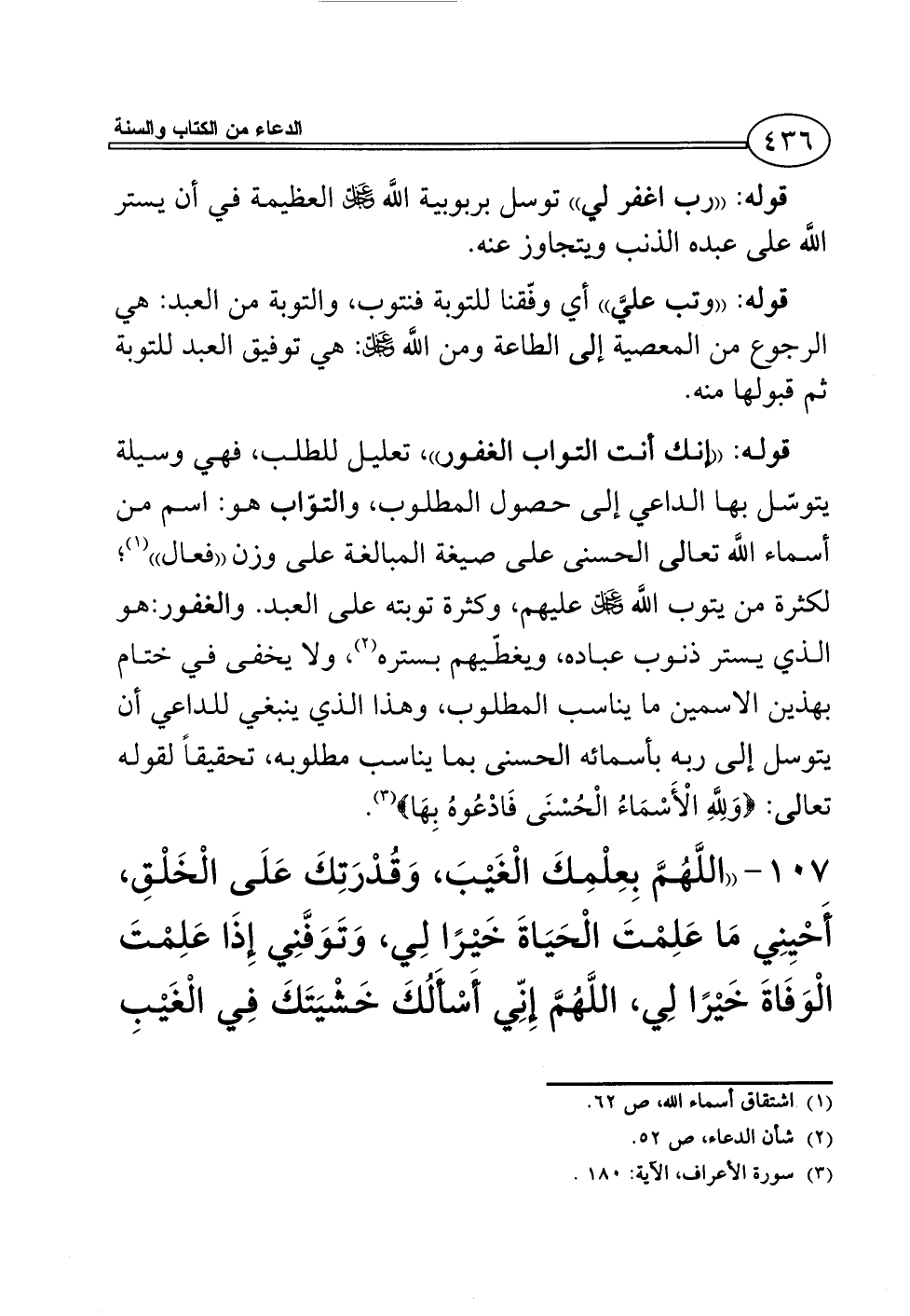 قوله: ((إنك أنت التواب الغفور)) , تعليل للطلب، فهي وسيلة يتوسّل بها الداعي إلى حصول المطلوب, والتوّاب هو: اسم من أسماء اللَّه تعالى الحسنى على صيغة المبالغة على وزن ((فعال)) (¬1)؛ لكثرة من يتوب اللَّه - عز وجل - عليهم، وكثرة توبته على العبد. والغفور: هو الذي يستر ذنوب عباده، ويغطّيهم بستره (¬2)، ولا يخفى في ختام بهذين الاسمين ما يناسب المطلوب، وهذا الذي ينبغي للداعي أن يتوسل إلى ربه بأسمائه الحسنى بما يناسب مطلوبه, تحقيقاً لقوله تعالى: {وَلِلَّهِ الْأَسْمَاءُ الْحُسْنَى فَادْعُوهُ بِهَا} (¬3).