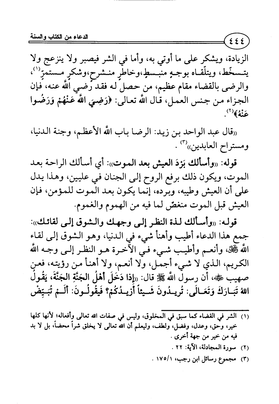 ويشكر على ما أوتي به. وأما في الشر فيصبر، ولا يتكلّف في طلب الزيادة، ويشكر على ما أوتي به، وأما في الشر فيصبر ولا ينزعج ولا يتسخّط، ويتلّقاه بوجهٍ منبسطٍ، وخاطرٍ منشرحٍ، وشكرٍ مستمرٍّ (¬1)، والرضى بالقضاء مقام عظيم، من حصل له فقد رضي اللَّه عنه، فإن الجزاء من جنس العمل، قال اللَّه تعالى: {رَضِيَ اللَّه عَنْهُمْ وَرَضُوا عَنْهُ} (¬2).