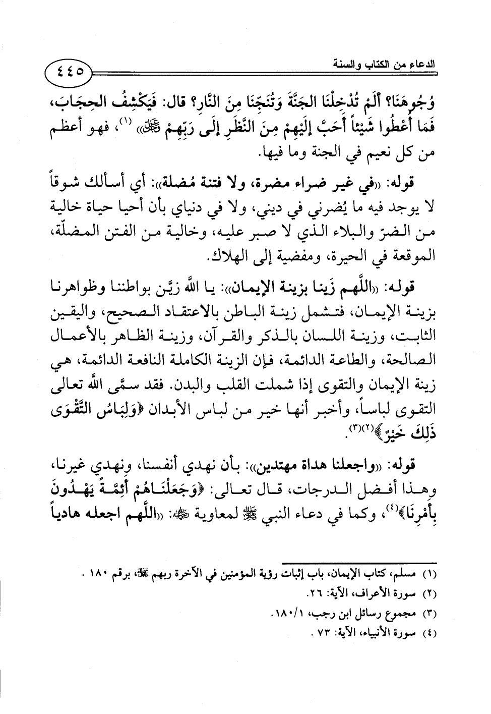 قوله: ((واجعلنا هداة مهتدين)): بأن نهدي أنفسنا، ونهدي غيرنا، وهذا أفضل الدرجات، قال تعالى: {وَجَعَلْنَاهُمْ أَئِمَّةً يَهْدُونَ بِأَمْرِنَا} (¬4)، وكما في دعاء النبي - صلى الله عليه وسلم - لمعاوية - رضي الله عنه -: ((اللَّهم اجعله هادياً