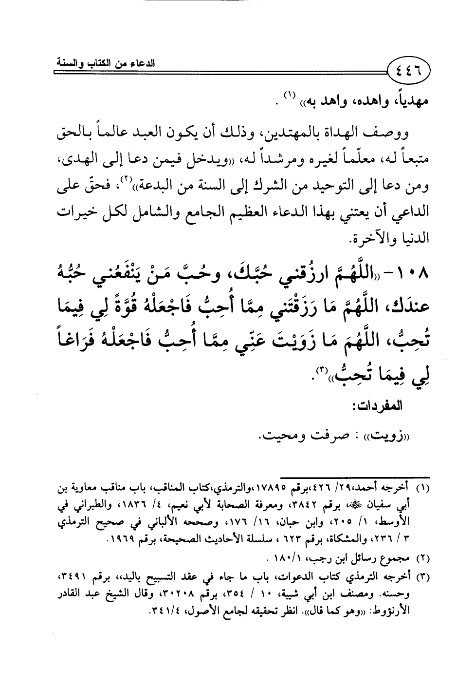 108 - ((اللَّهُمَّ ارزُقني حُبَّكَ، وحُبَّ مَنْ يَنْفَعُني حُبُّهُ عندَك، اللَّهُمَّ مَا رَزَقْتَني مِمَّا أُحِبُّ فَاجْعَلْهُ قُوَّةً لِي فِيمَا تُحِبُّ، اللَّهُمَ مَا زَوَيْتَ عَنِّي مِمَّا أُحِبُّ فَاجْعَلْهُ فَرَاغاً لِي فِيمَا تُحِبُّ)) (¬3).