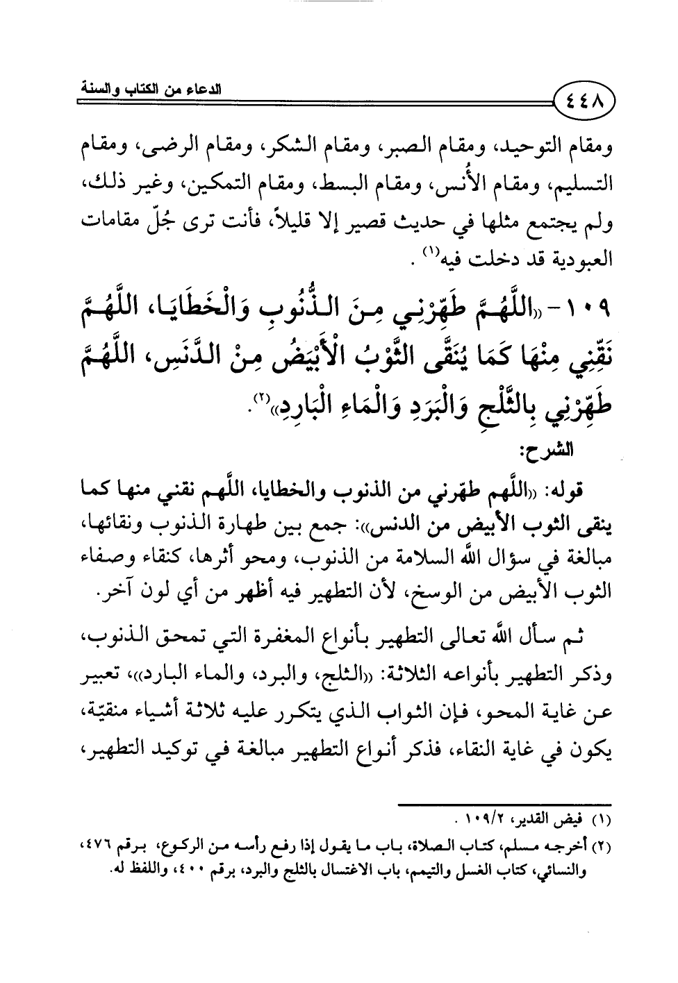 109 - ((اللَّهُمَّ طَهِّرْنِي مِنَ الذُّنُوبِ وَالْخَطَايَا، اللَّهُمَّ نَقِّنِي مِنْهَا كَمَا يُنَقَّى الثَّوْبُ الْأَبْيَضُ مِنْ الدَّنَسِ، اللَّهُمَّ طَهِّرْنِي بِالثَّلْجِ وَالْبَرَدِ وَالْمَاءِ الْبَارِدِ)) (¬2).
