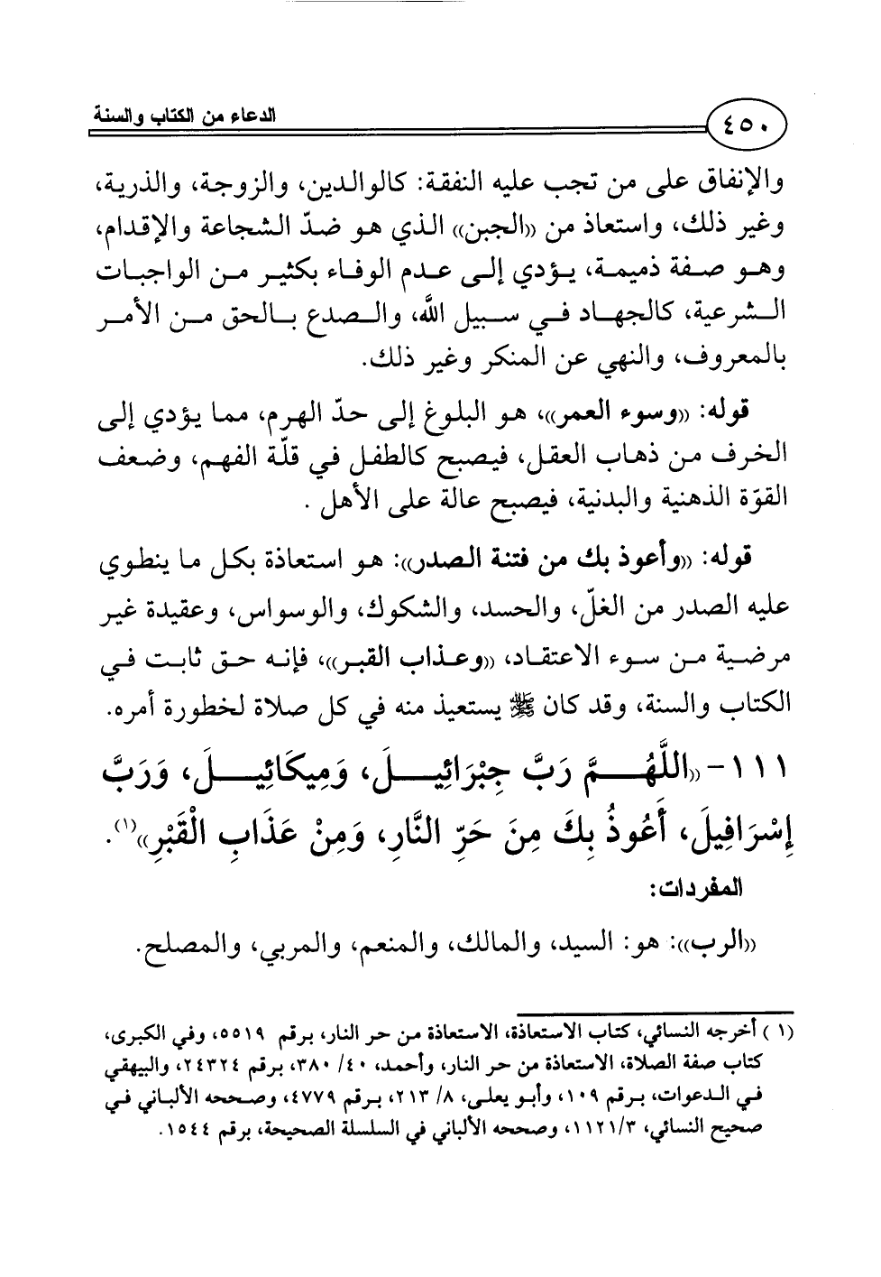 111 - ((اللَّهُمَّ رَبَّ جِبْرَائِيلَ، وَمِيكَائِيلَ، وَرَبَّ إِسْرَافِيلَ، أَعُوذُ بِكَ مِنَ حَرِّ النَّارِ، وَمِنْ عَذَابِ الْقَبْرِ)) (¬1).