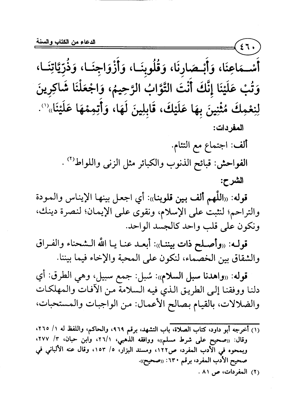 قوله: ((وأصلح ذات بيننا)): أبعد عنا يا اللَّه الشحناء والفراق والشقاق بين الخصماء، لنكون على المحبة والإخاء فيما بيننا.