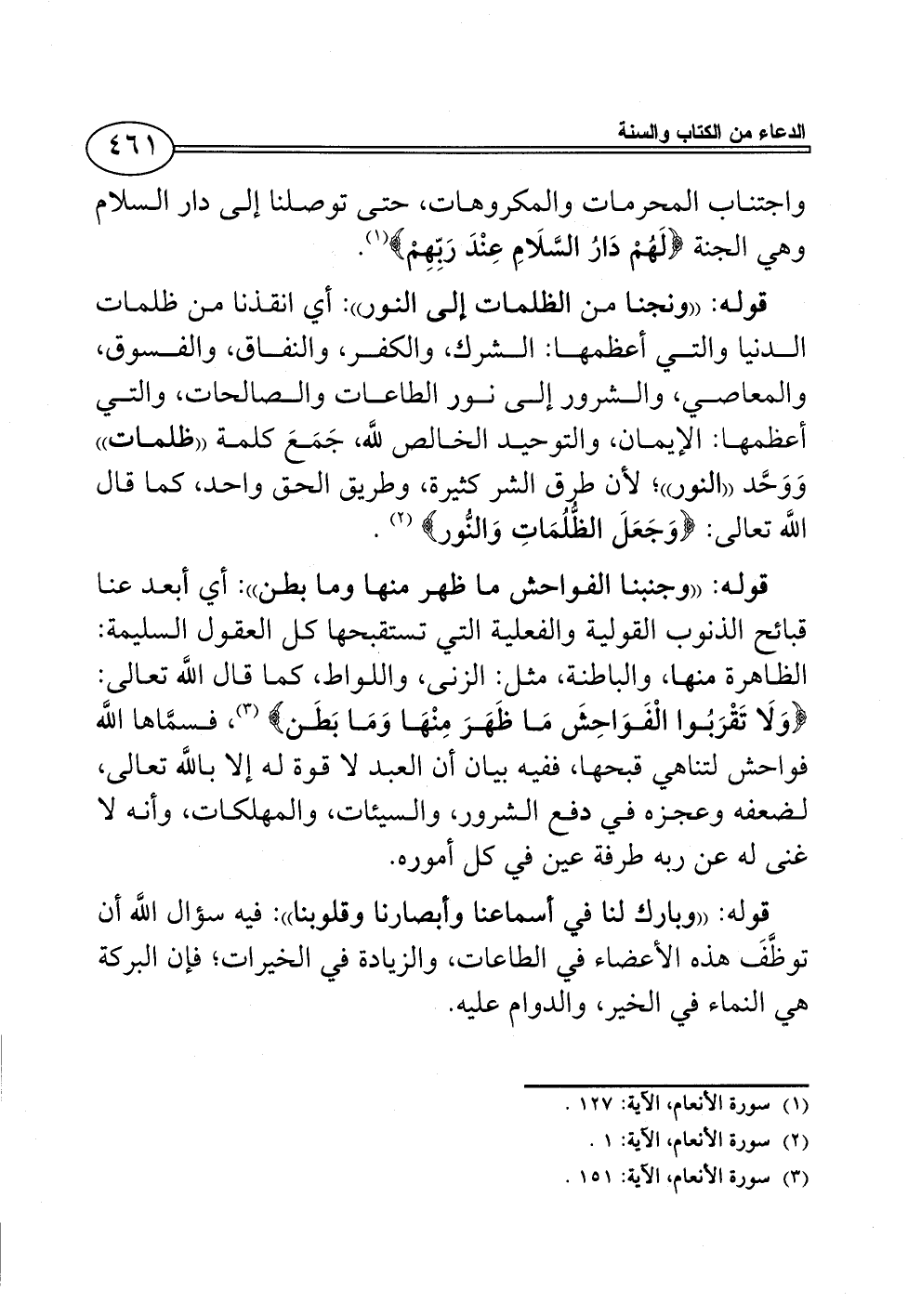 والضلالات، بالقيام بصالح الأعمال: من الواجبات والمستحبات، واجتناب المحرمات والمكروهات، حتى توصلنا إلى دار السلام وهي الجنة {لَهُمْ دَارُ السَّلَامِ عِنْدَ رَبِّهِمْ} (¬1).