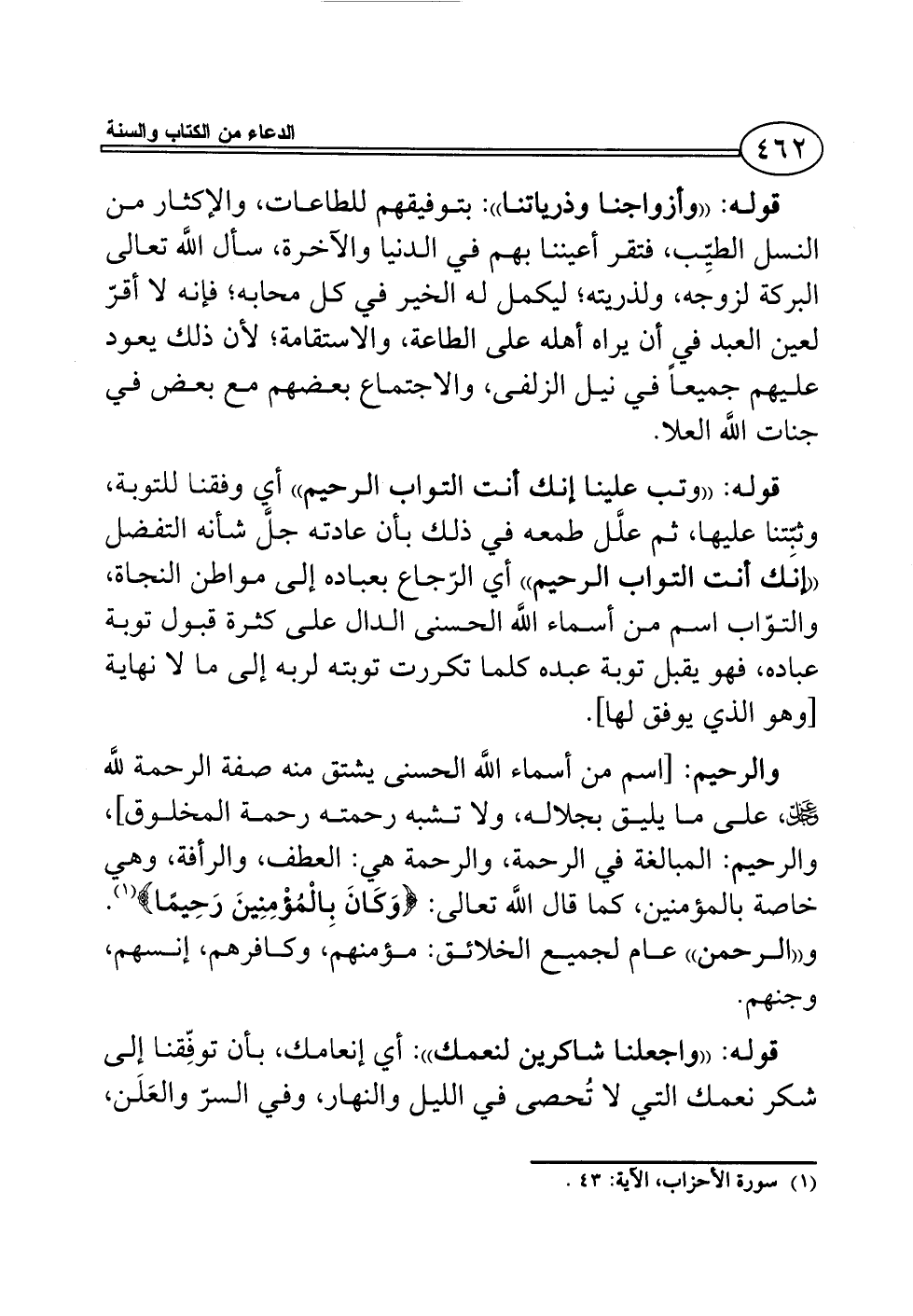 قوله: ((وأزواجنا وذرياتنا)): بتوفيقهم للطاعات، والإكثار من النسل الطيِّب، فتقر أعيننا بهم في الدنيا والآخرة، سأل اللَّه تعالى البركة لزوجه، ولذريته؛ ليكمل له الخير في كل محابه؛ فإنه لا أقرّ لعين العبد في أن يراه أهله على الطاعة، والاستقامة؛ لأن ذلك يعود عليهم جميعاً في نيل الزلفى، والاجتماع بعضهم مع بعض في جنات اللَّه العلا.
