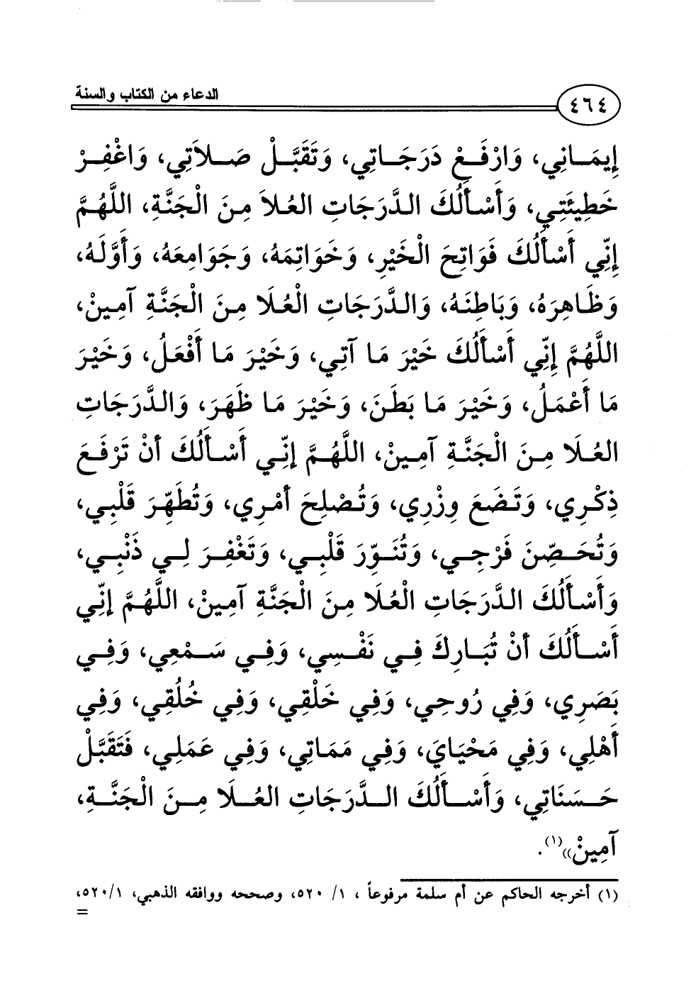 (¬1) أخرجه الحاكم عن أم سلمة مرفوعاً، 1/ 520، وصححه ووافقه الذهبي، 1/ 520، والبيهقي في الدعوات، برقم 225، والطبراني في الكبير، 23/ 326، برقم 717، والأوسط، 6/ 213، برقم 6218، وقال الهيثمي في مجمع الزوائد ومنبع الفوائد: ((رواه الطبراني في الكبير ورواه في الأوسط باختصار بأسانيد، وأحد إسنادي الكبير، والسياق له، ورجال الأوسط ثقات))، مجمع الزوائد، 10/ 280.