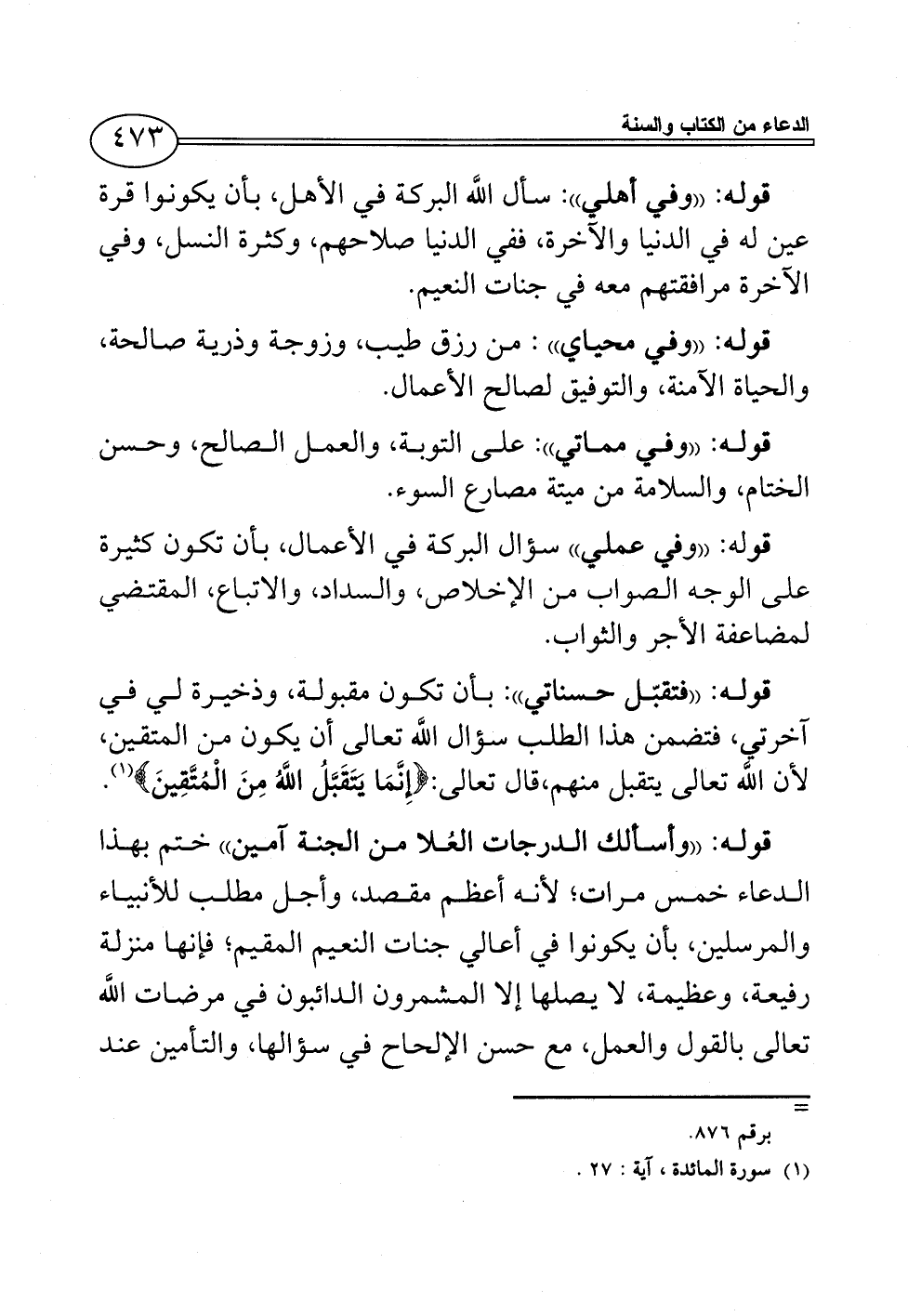 قوله: ((فتقبّل حسناتي)): بأن تكون مقبولة، وذخيرة لي في آخرتي, فتضمن هذا الطلب سؤال اللَّه تعالى أن يكون من المتقين، لأن اللَّه تعالى يتقبل منهم, قال تعالى: {إِنَّمَا يَتَقَبَّلُ اللَّهُ مِنَ الْمُتَّقِينَ} (¬1).