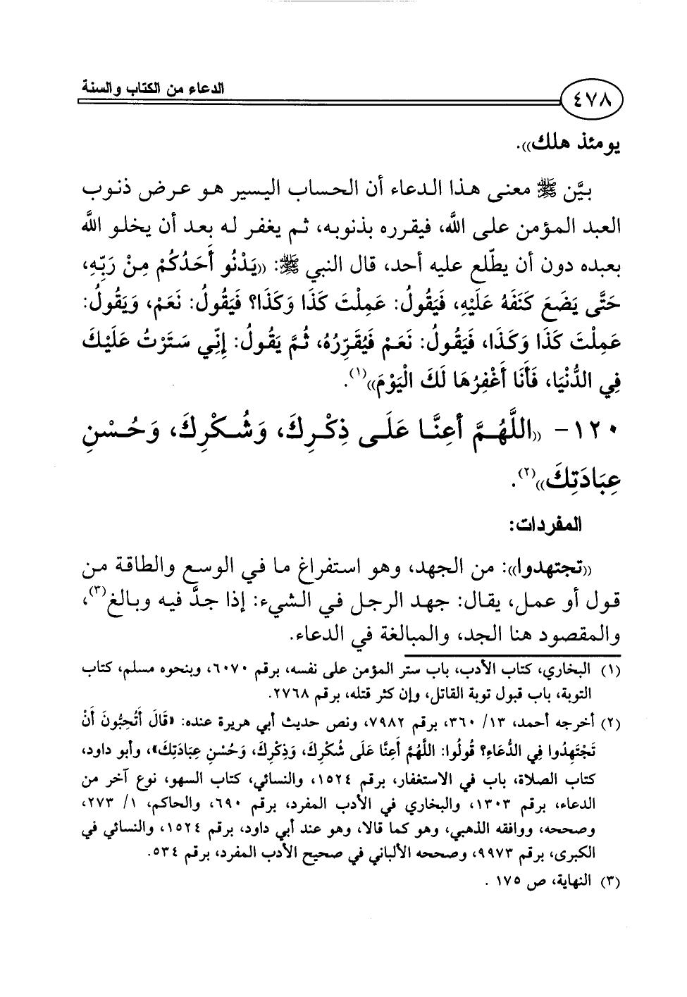 (¬2) أخرجه أحمد، 13/ 360، برقم 7982، ونص حديث أبي هريرة عنده: <قَالَ أَتُحِبُّونَ أَنْ تَجْتَهِدُوا فِي الدُّعَاءِ؟ قُولُوا: اللَّهُمَّ أَعِنَّا عَلَى شُكْرِكَ، وَذِكْرِكَ، وَحُسْنِ عِبَادَتِكَ>، وأبو داود، كتاب الصلاة، باب في الاستغفار، برقم 1524، والنسائي، كتاب السهو، نوع آخر من الدعاء، برقم 1303، والبخاري في الأدب المفرد، برقم 690، والحاكم، 1/ 273، وصححه، ووافقه الذهبي، وهو كما قالا، وهو عند أبي داود، برقم 1524، والنسائي في الكبرى، برقم 9973، وصححه الألباني في صحيح الأدب المفرد، برقم 534.