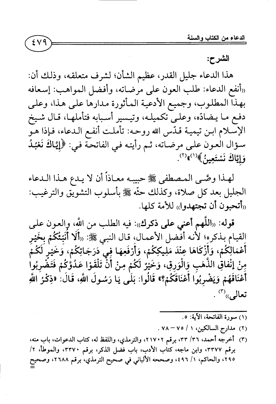 قوله: ((اللَّهم أعني على ذكرك)): فيه الطلب من اللَّه، والعون على القيام بذكره؛ لأنه أفضل الأعمال، قال النبي - صلى الله عليه وسلم -: ((أَلَا أُنَبِّئُكُمْ بِخَيْرِ أَعْمَالِكُمْ، وَأَزْكَاهَا عِنْدَ مَلِيكِكُمْ، وَأَرْفَعِهَا فِي دَرَجَاتِكُمْ، وَخَيْرٍ لَكُمْ مِنْ إنْفاقِ الذَّهَبِ وَالْوَرِقِ، وَخَيْرٌ لَكُمْ مِنْ أَنْ تَلْقَوْا عَدُوَّكُمْ فَتَضْرِبُوا أَعْنَاقَهُمْ وَيَضْرِبُوا أَعْنَاقَكُمْ؟ > قَالُوا: بَلَى يَا رَسُولَ اللَّهِ، قَالَ: <ذِكْرُ اللَّهِ تعالى)) (¬3).
