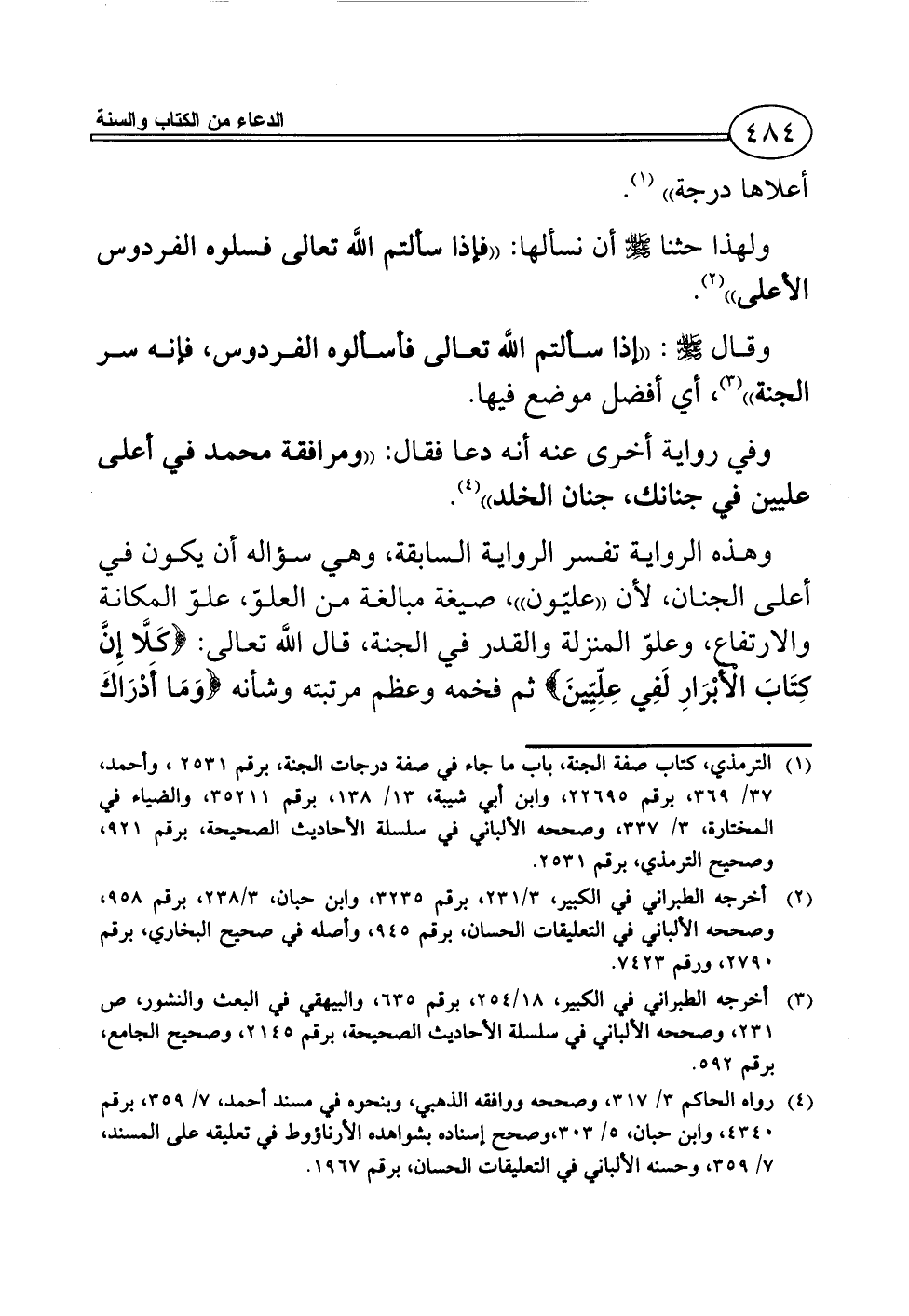 وهذه الرواية تفسر الرواية السابقة، وهي سؤاله أن يكون في أعلى الجنان، لأن ((عليّون))، صيغة مبالغة من العلوّ، علوّ المكانة والارتفاع، وعلوّ المنزلة والقدر في الجنة، قال اللَّه تعالى: {كَلَّا إِنَّ