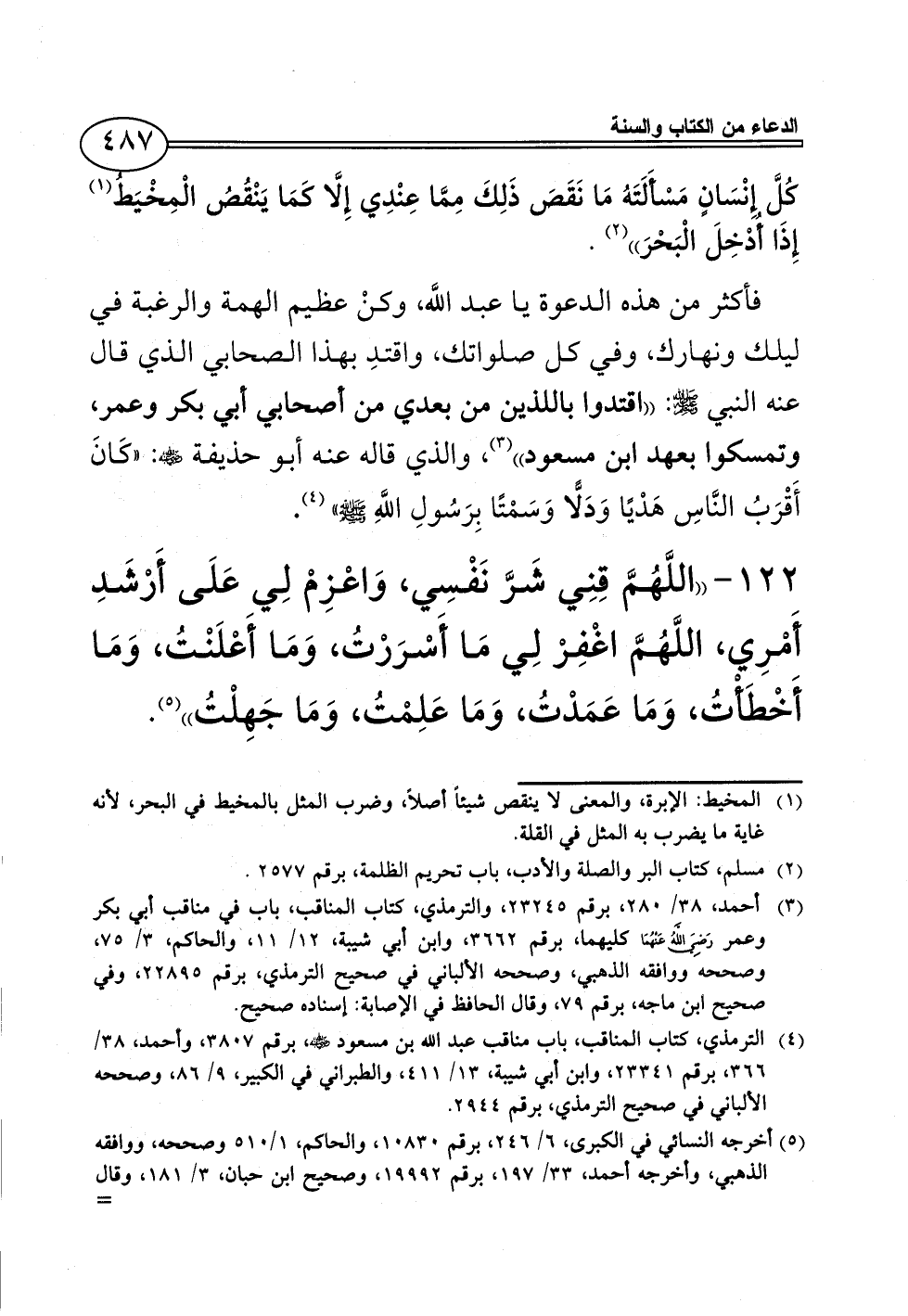122 - ((اللَّهُمَّ قِنِي شَرَّ نَفْسِي، وَاعْزِمْ لِي عَلَى أَرْشَدِ أَمْرِي، اللَّهُمَّ اغْفِرْ لِي مَا أَسْرَرْتُ، وَمَا أَعْلَنْتُ، وَمَا أَخْطَأْتُ، وَمَا عَمَدْتُ، وَمَا عَلِمْتُ، وَمَا جَهِلْتُ)) (¬5).