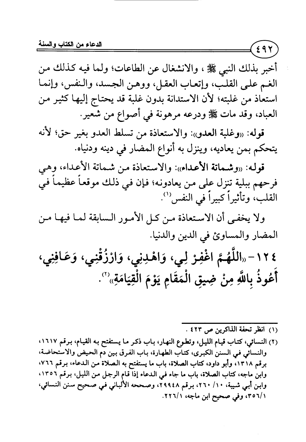 124 - ((اللَّهُمَّ اغْفِرْ لِي، وَاهْدِنِي، وَارْزُقْنِي، وَعَافِنِي، أَعُوذُ بِاللَّهِ مِنْ ضِيقِ الْمَقَامِ يَوْمَ الْقِيَامَةِ)) (¬2).