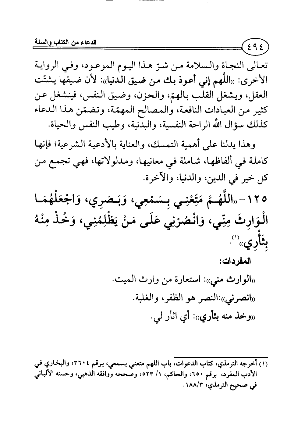 125 - ((اللَّهُمَّ مَتِّعْنِي بِسَمْعِي، وَبَصَرِي، وَاجْعَلْهُمَا الْوَارِثَ مِنِّي، وَانْصُرْنِي عَلَى مَنْ يَظْلِمُنِي، وَخُذْ مِنْهُ بِثَأْرِي)) (¬1).