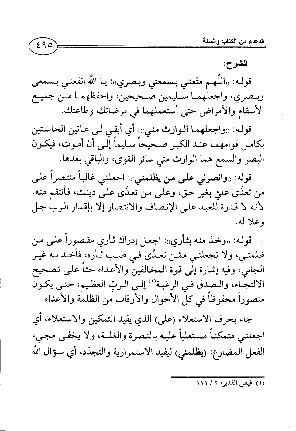 قوله: ((واجعلهما الوارث مني)): أي أبقي لي هاتين الحاستين بكامل قوامهما عند الكبر صحيحاً سليماً إلى أن أموت, فيكون البصر والسمع هما الوارث مني سائر القوى، والباقي بعدها.