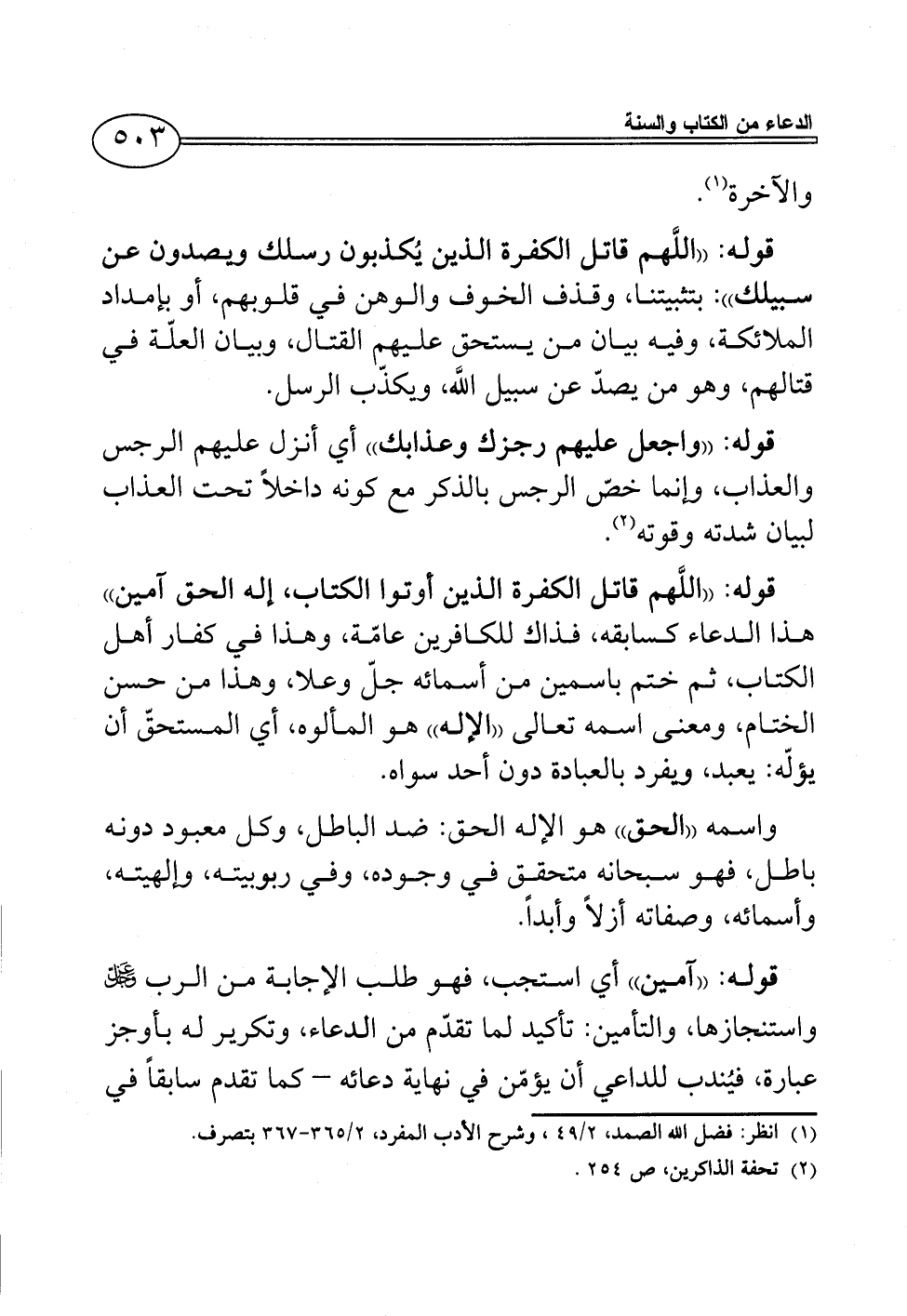 قوله: ((اللَّهم قاتل الكفرة الذين يُكذبون رسلك ويصدون عن سبيلك)): بتثبيتنا، وقذف الخوف والوهن في قلوبهم، أو بإمداد الملائكة، وفيه بيان من يستحق عليهم القتال، وبيان العلّة في