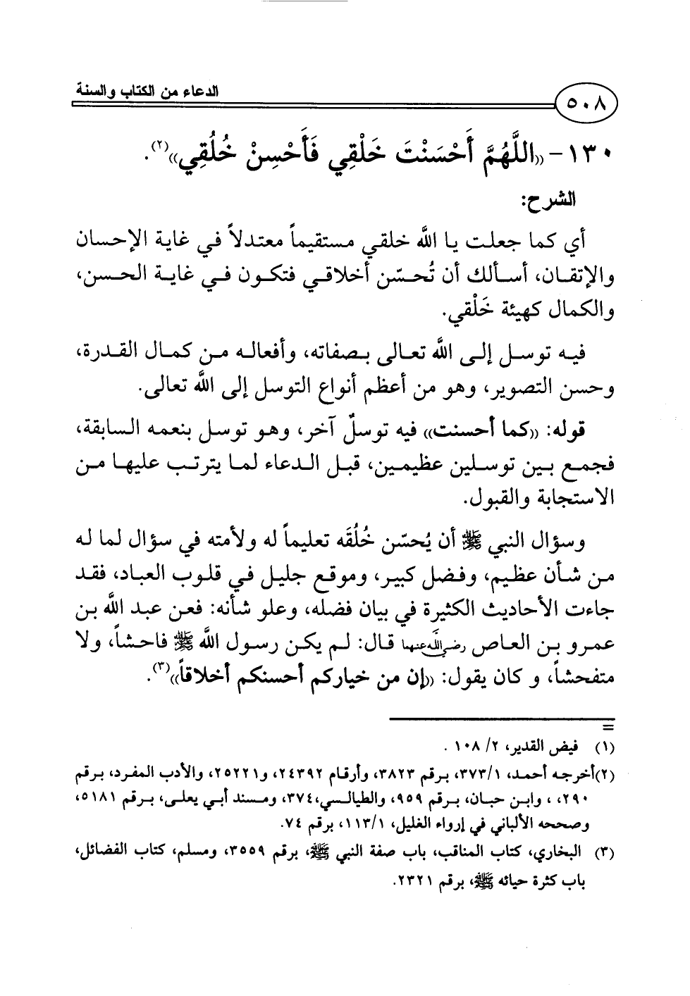 130 - ((اللَّهُمَّ أَحْسَنْتَ خَلْقِي فَأَحْسِنْ خُلُقِي)) (¬3).