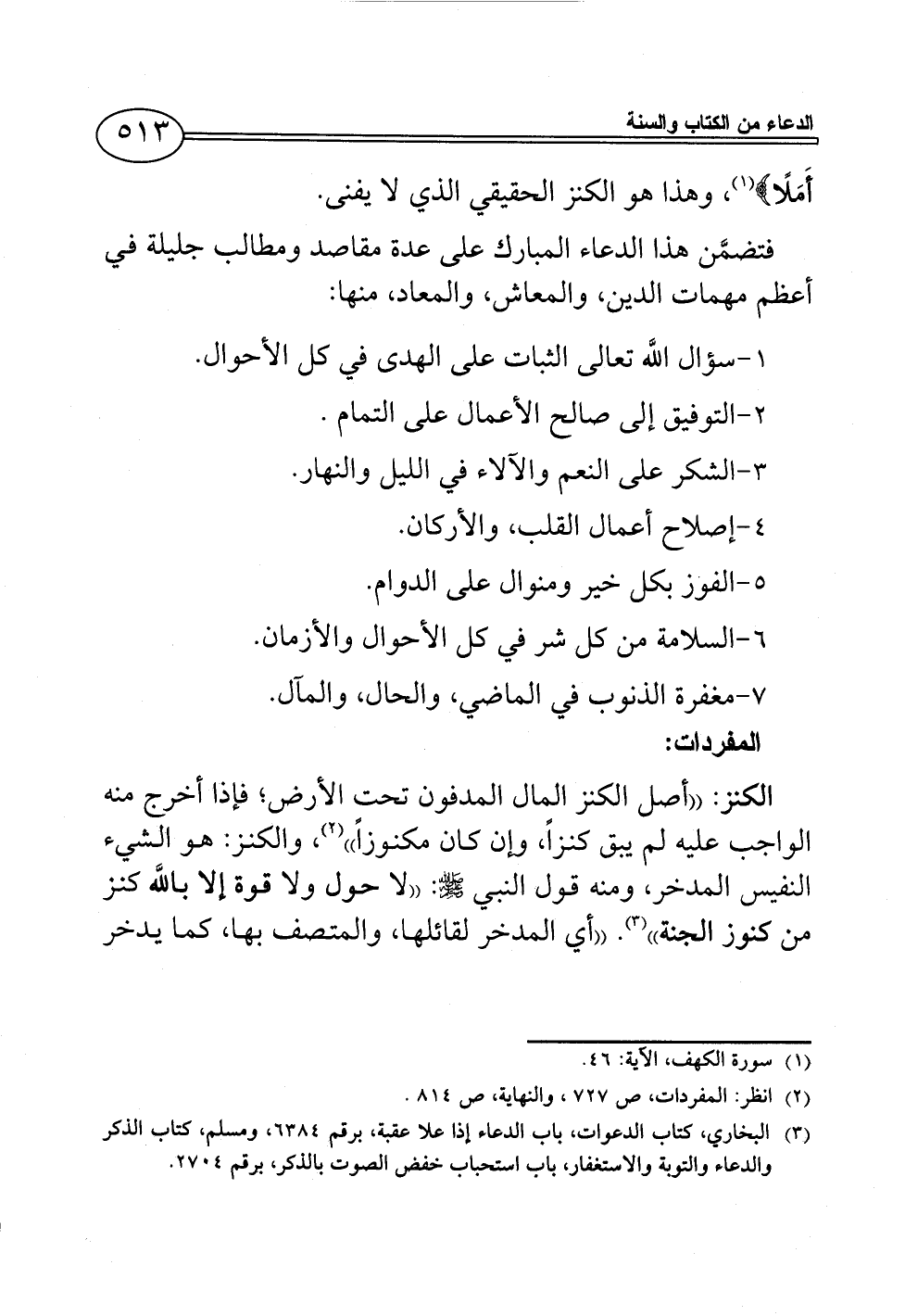 ينقطع في الدنيا وفي الآخرة, كما قال اللَّه تعالى: {الْمَالُ وَالْبَنُونَ زِينَةُ الْحَيَاةِ الدُّنْيَا وَالْبَاقِيَاتُ الصَّالِحَاتُ خَيْرٌ عِنْدَ رَبِّكَ ثَوَابًا وَخَيْرٌ أَمَلًا} (¬1)، وهذا هو الكنز الحقيقي الذي لا يفنى.