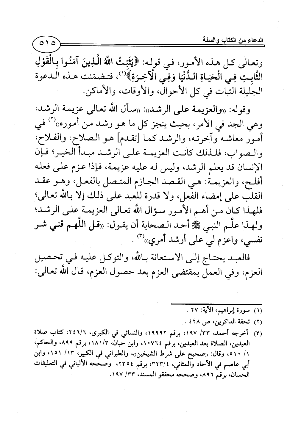 سؤال الملكين, وعند المرور على الصراط وقد جمع اللَّه تبارك وتعالى كل هذه الأمور, في قوله: {يُثَبِّتُ اللَّهُ الَّذِينَ آمَنُوا بِالْقَوْلِ الثَّابِتِ فِي الْحَيَاةِ الدُّنْيَا وَفِي الْآخِرَةِ} (¬1)، فتضمّنت هذه الدعوة الجليلة الثبات في كل الأحوال, والأوقات, والأماكن.