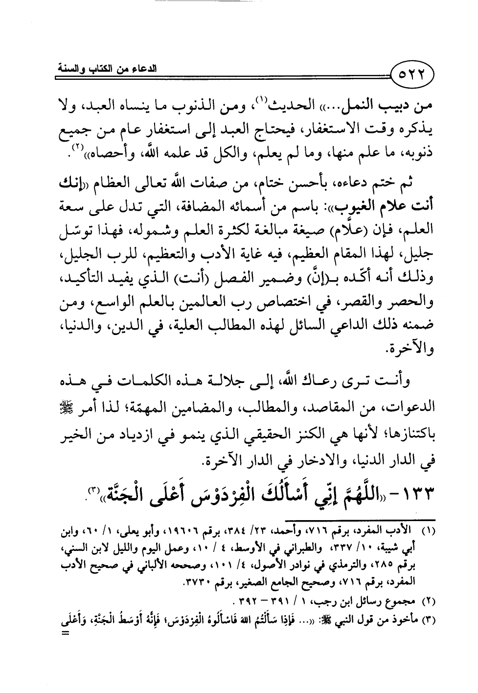 133 - ((اللَّهُمَّ إنِّي أَسْأَلُكَ الْفِرْدَوْسَ أَعْلَى الْجَنَّة)) (¬3).