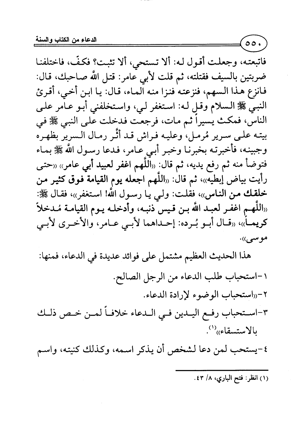 فقال: ذاك قاتلي الذي رماني، فقصدت له، فلحقته، فلما رآني ولَّى، فاتبعته، وجعلت أقول له: ألا تستحي، ألا تثبت؟ فكفّ، فاختلفنا ضربتين بالسيف فقتلته، ثم قلت لأبي عامر: قتل اللَّه صاحبك، قال: فانزع هذا السهم، فنزعته فنزا منه الماء، قال: يا ابن أخي، أقرئ النبي - صلى الله عليه وسلم - السلام وقل له: استغفر لي، واستخلفني أبو عامر على الناس، فمكث يسيراً ثم مات، فرجعت فدخلت على النبي - صلى الله عليه وسلم - في بيته على سرير مُرمل، وعليه فراش قد أثَّر رمال السرير بظهره وجبينه، فأخبرته بخبرنا وخبر أبي عامر، فدعا رسول اللَّه - صلى الله عليه وسلم - بماء فتوضأ منه ثم رفع يديه، ثم قال: ((اللَّهم اغفر لعبيد أبي عامر)) ((حتى رأيت بياض إبطيه))، ثم قال: ((اللَّهم اجعله يوم القيامة فوق كثير من خلقك من الناس))، فقلت: ولي يا رسول اللَّه! استغفر))، فقال - صلى الله عليه وسلم -: ((اللَّهم اغفر لعبد اللَّه بن قيس ذنبه، وأدخله يوم القيامة مُدخلاً كريماً))، ((قال أبو بُرده: إحداهما لأبي عامر، والأخرى لأبي موسى)).